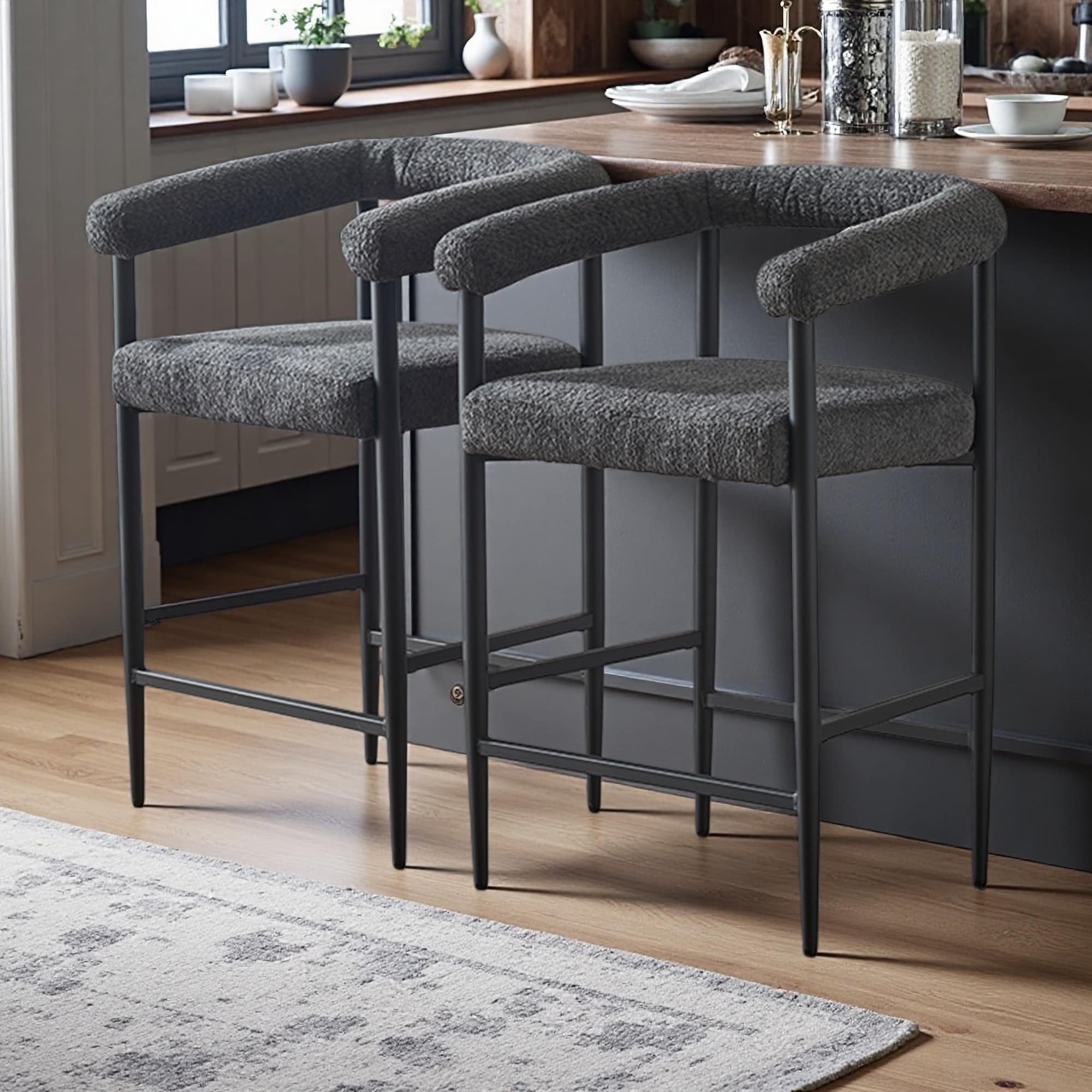 Modern Boucle Upholstered Bar Stools Set of 2 with Armrests and Metal Frame for Kitchen Island