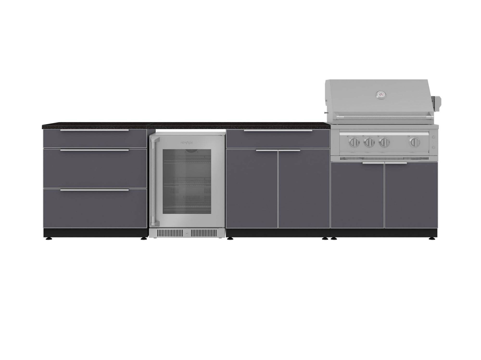 NewAge Outdoor Kitchens Aluminum 7-Piece Cabinet Set with 3-Drawer, Bar, Grill Cabinet, Performance Grill, Countertops and Fridge