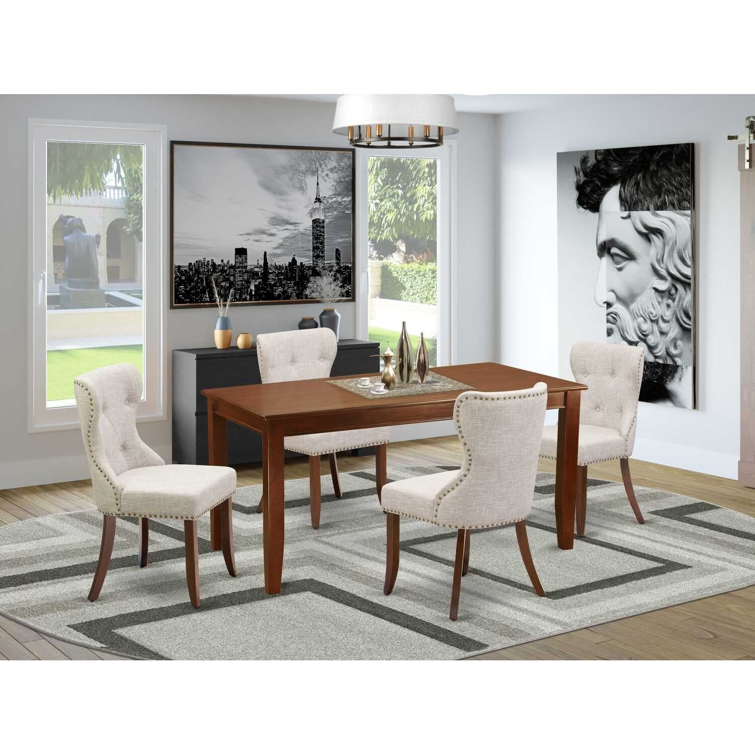 Dining Room Set for 4 - Linen Fabric Parsons Chairs & Mahogany Table - Modern Kitchen Furniture