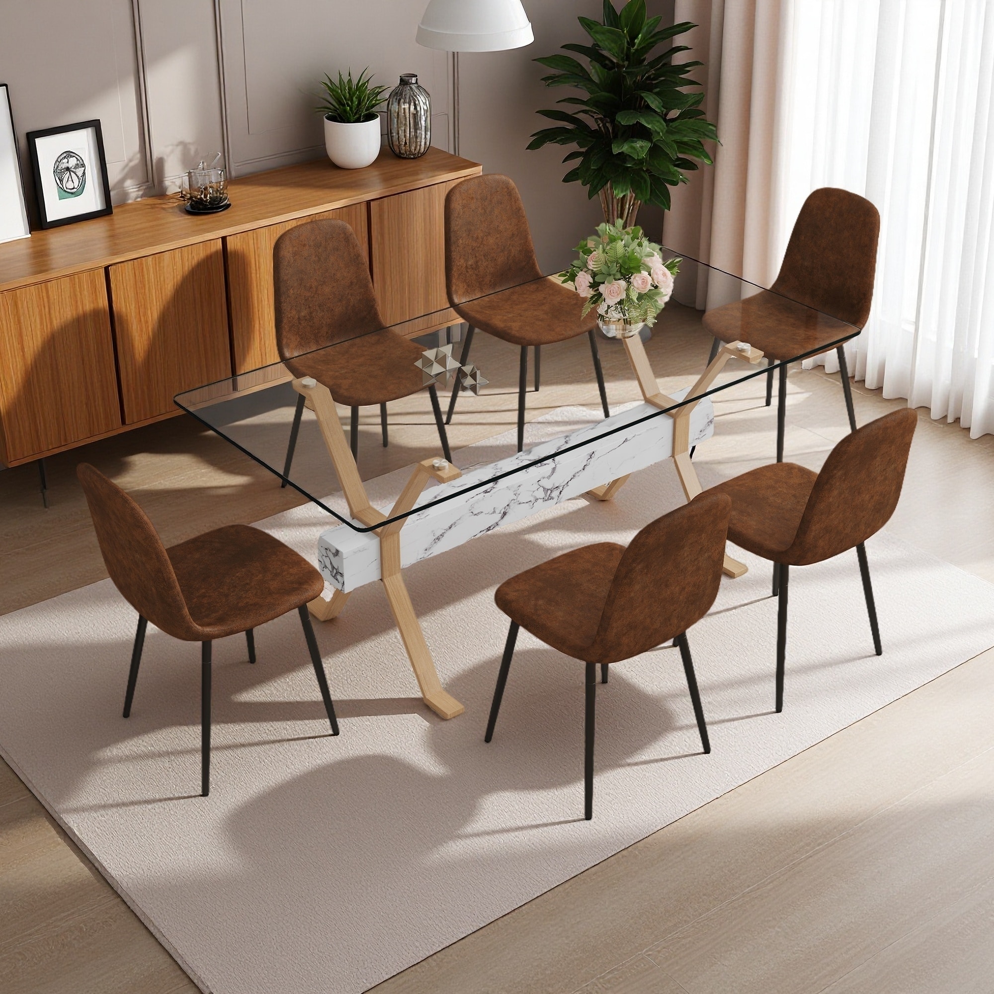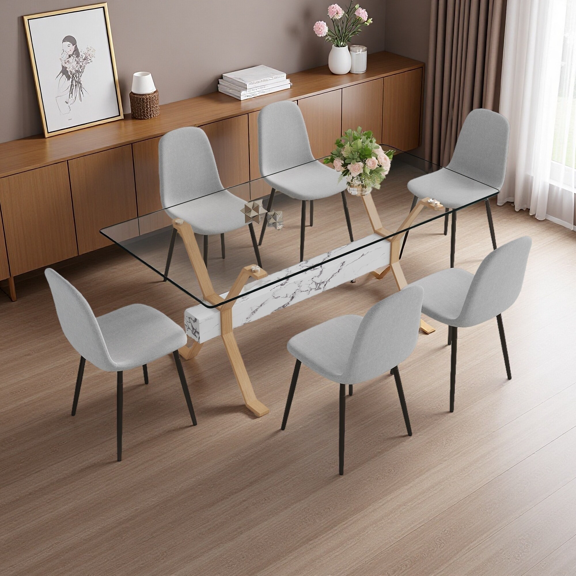 Elegant transparent tempered glass dining table - 71"x35.4" with 6 technology-fabric chairs with metal legs
