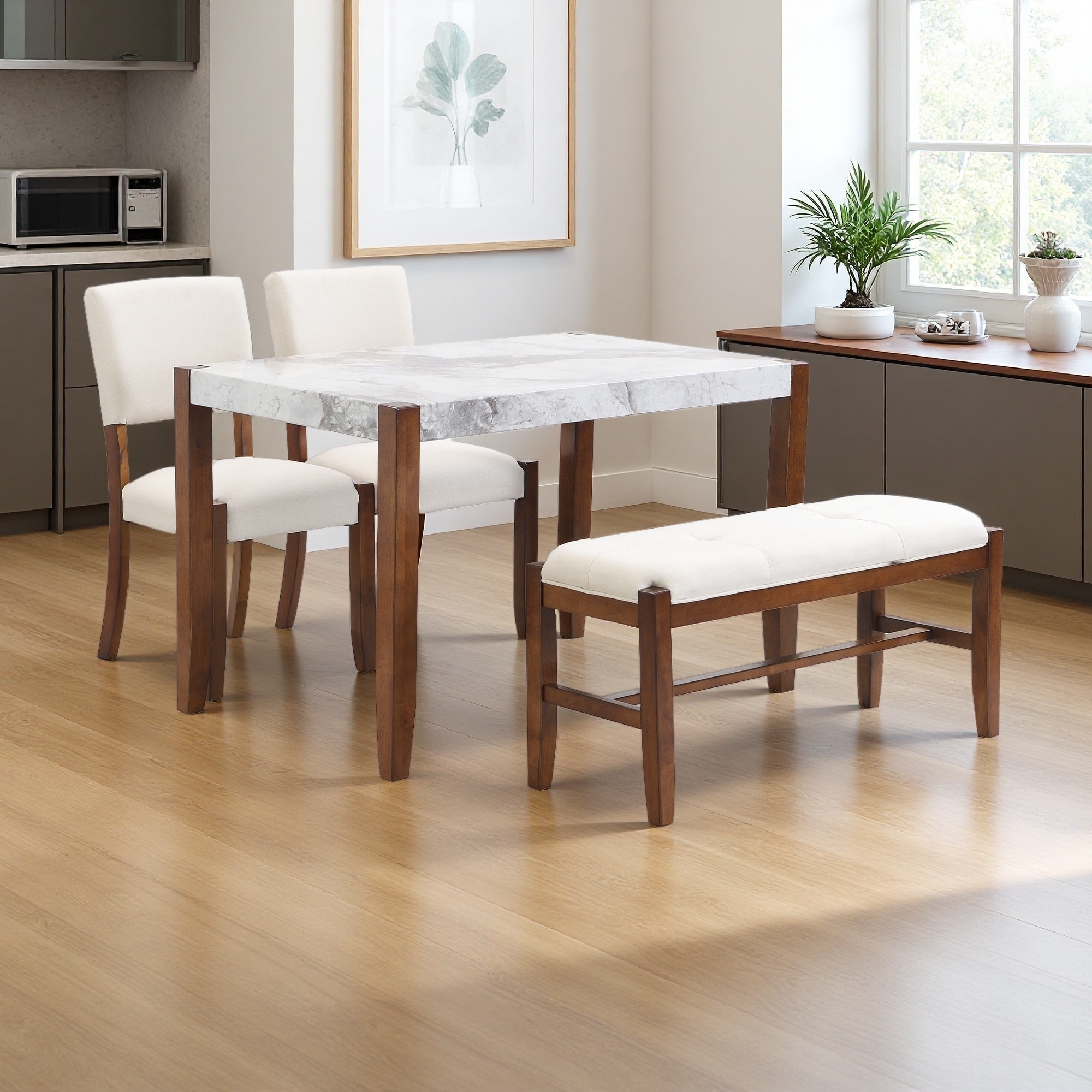 4-Piece Modern Dining Set, 46" Faux Marble Table with 2 Upholstered Chairs & Bench, Space-Saving for Kitchen