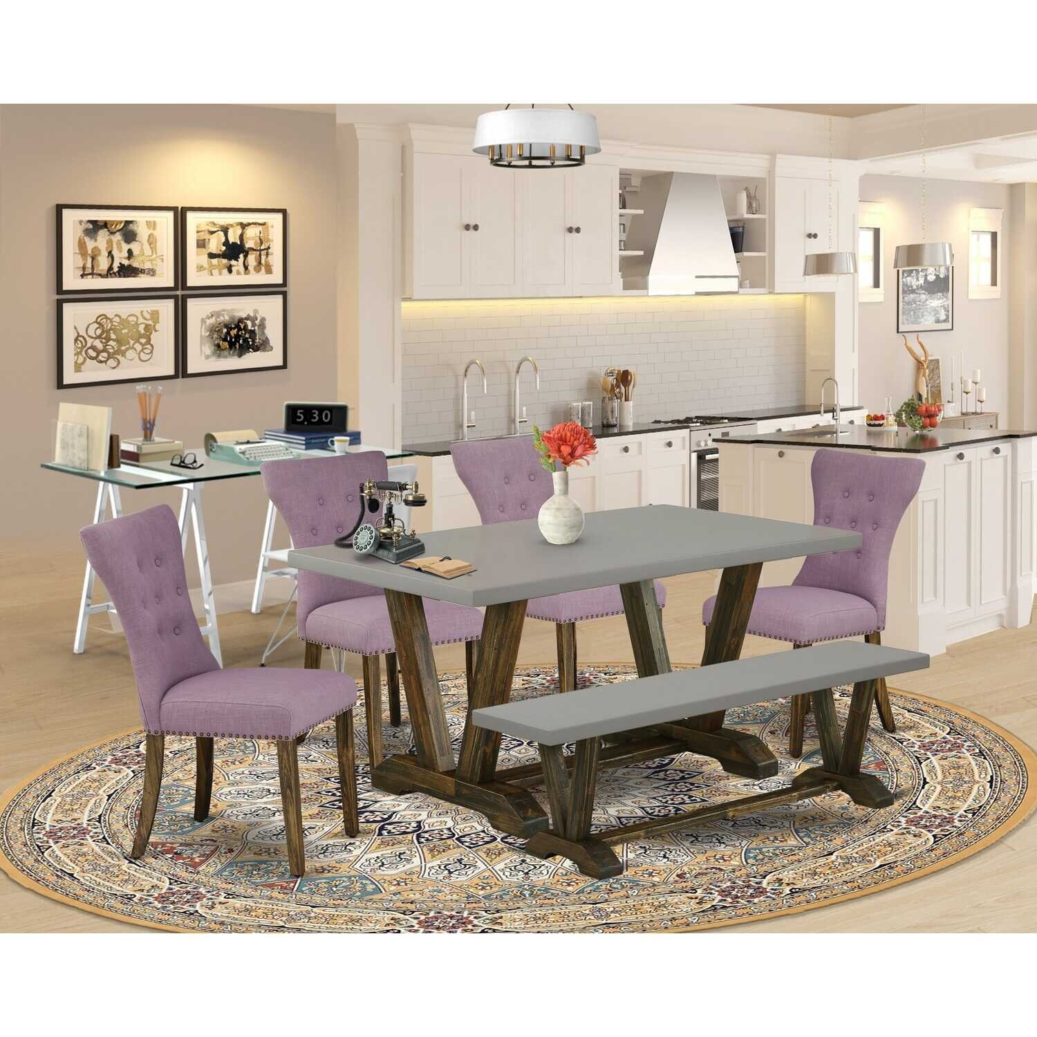HomeStock 6-Pc Rectangle Distressed Jacobean Finish Solid Wood Top Dining Table with 1-Bench, 4-Chairs