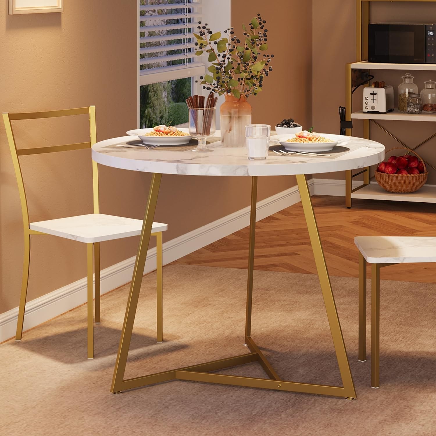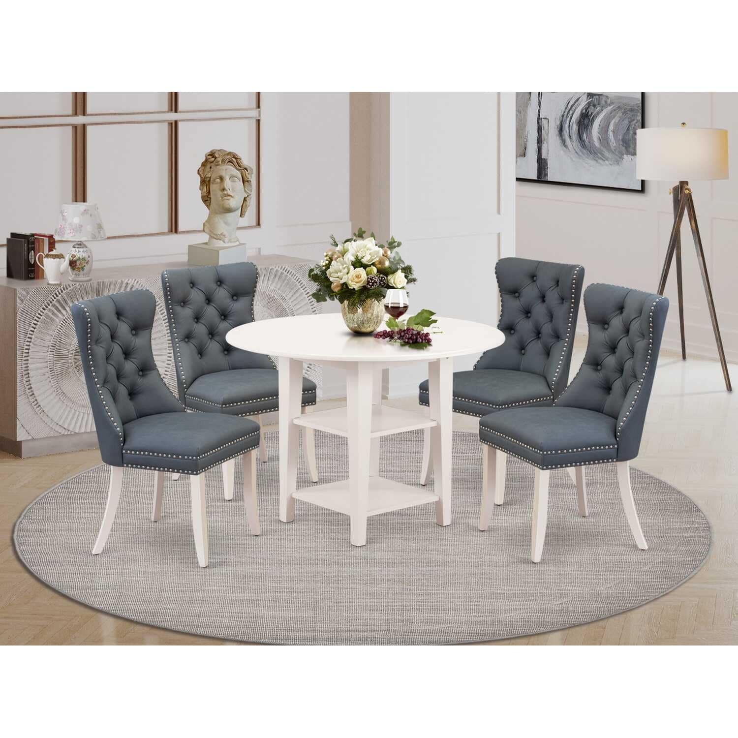 5-Piece Linen White Finish Solid Wood Top - Round Dining Room Set - Seats 4