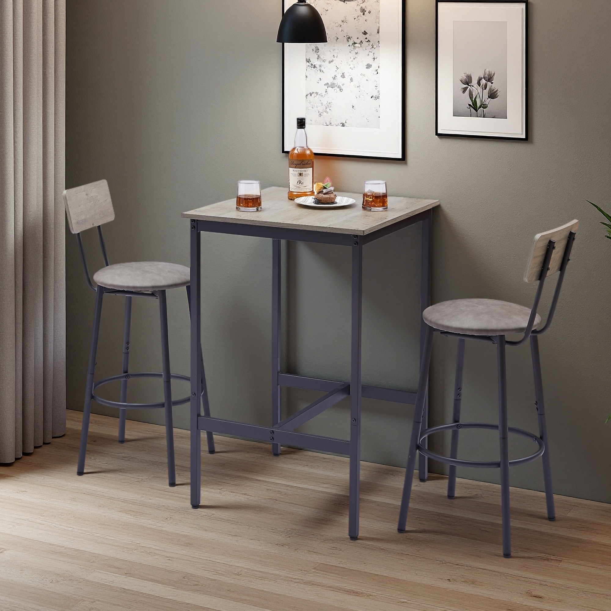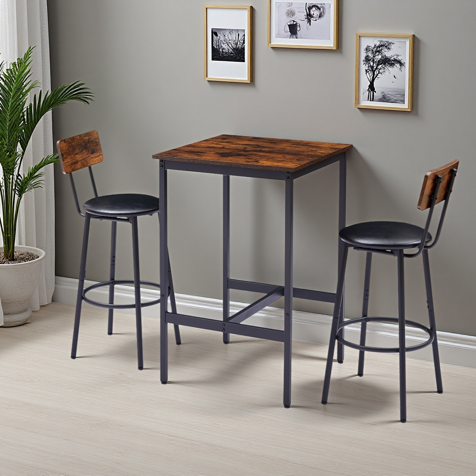 Bar Table Set with 2 Stools, PU Soft Seats with Backrest, 23.62" W x 23.62" D x 35.43" H