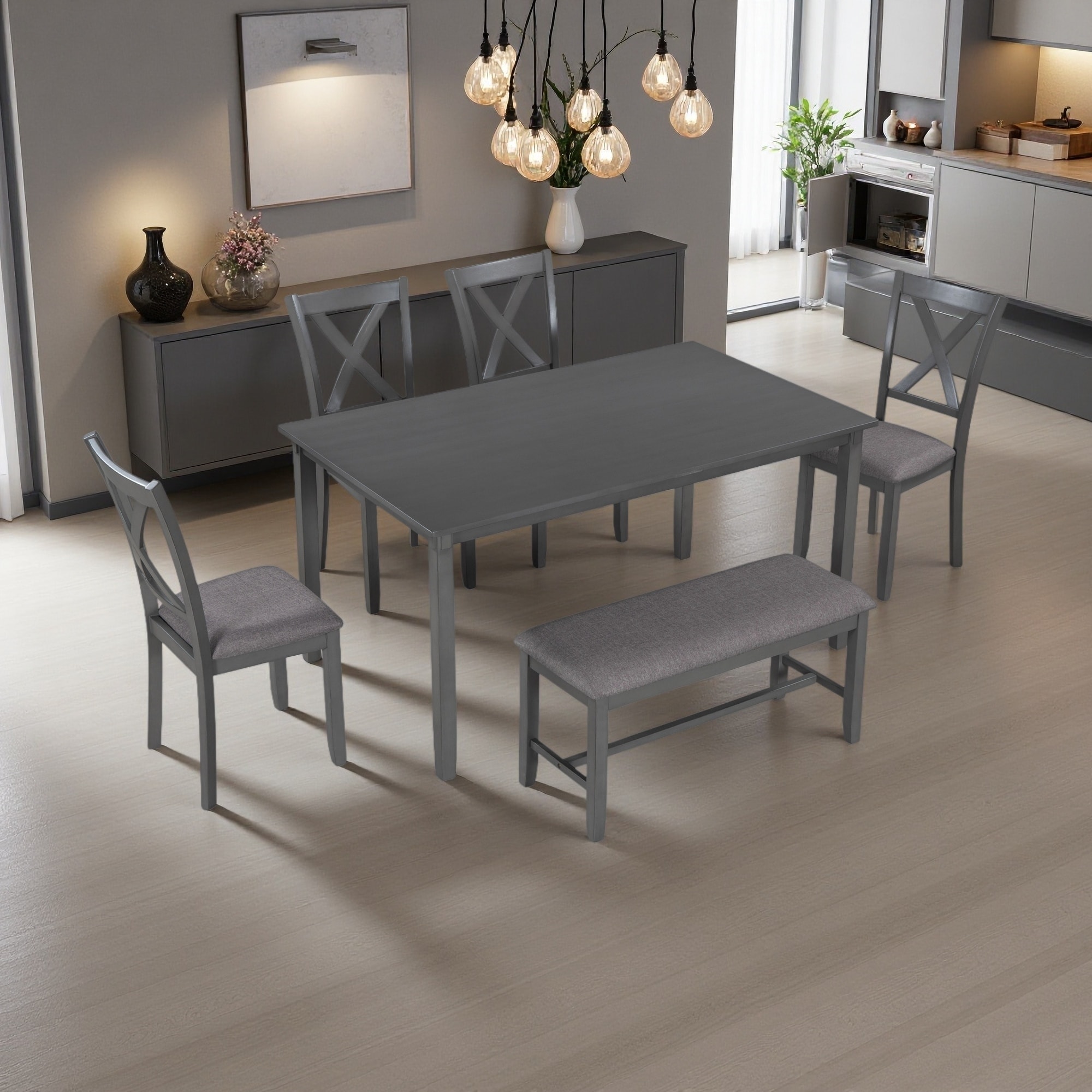 6-Piece Kitchen Dining Set, Wooden Rectangular Table with 4 Fabric Chairs & Bench, Family Furniture
