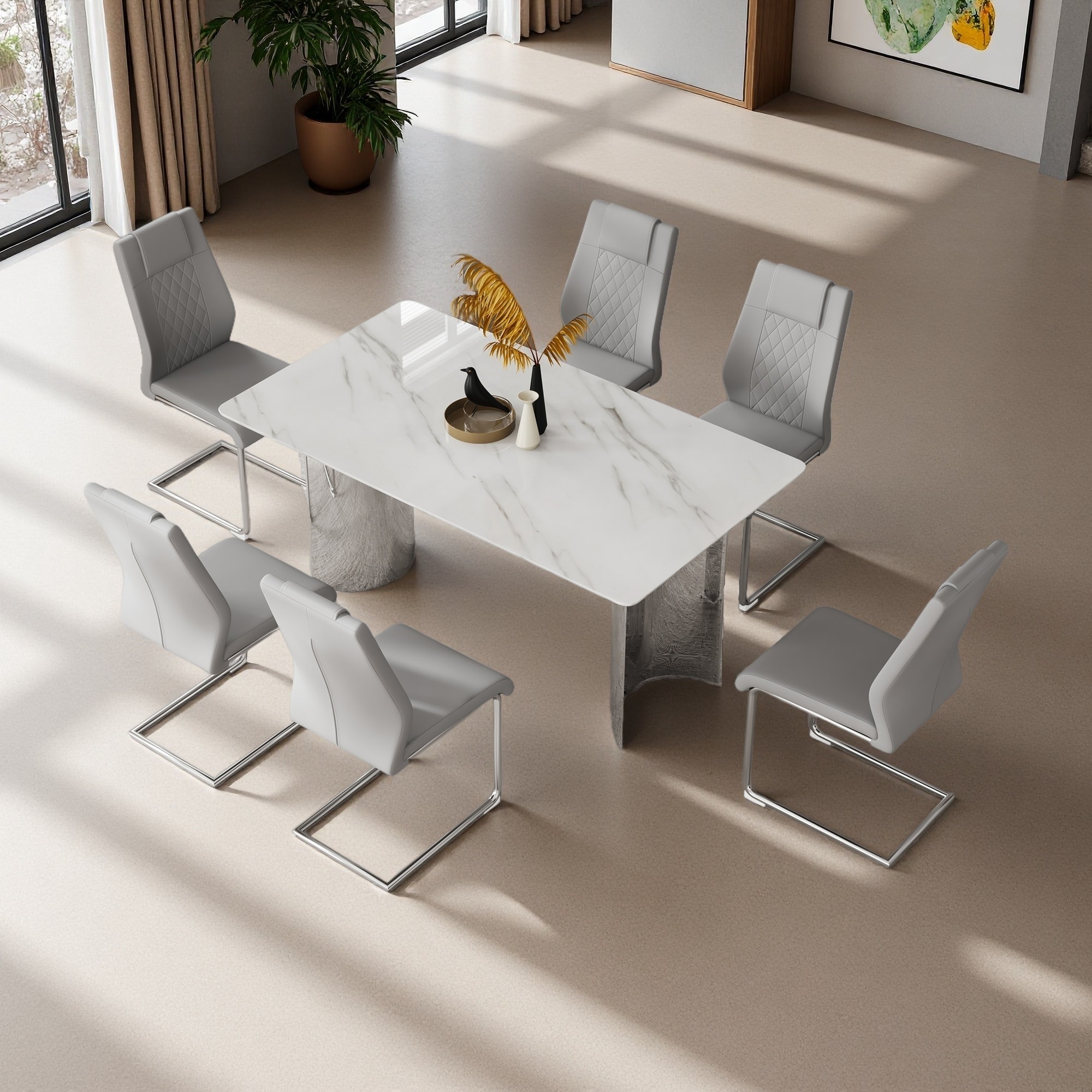 Modern Dining Table and Chair Set, Marble-Style Glass Top with Stainless Steel Legs & Comfortable PU Seats