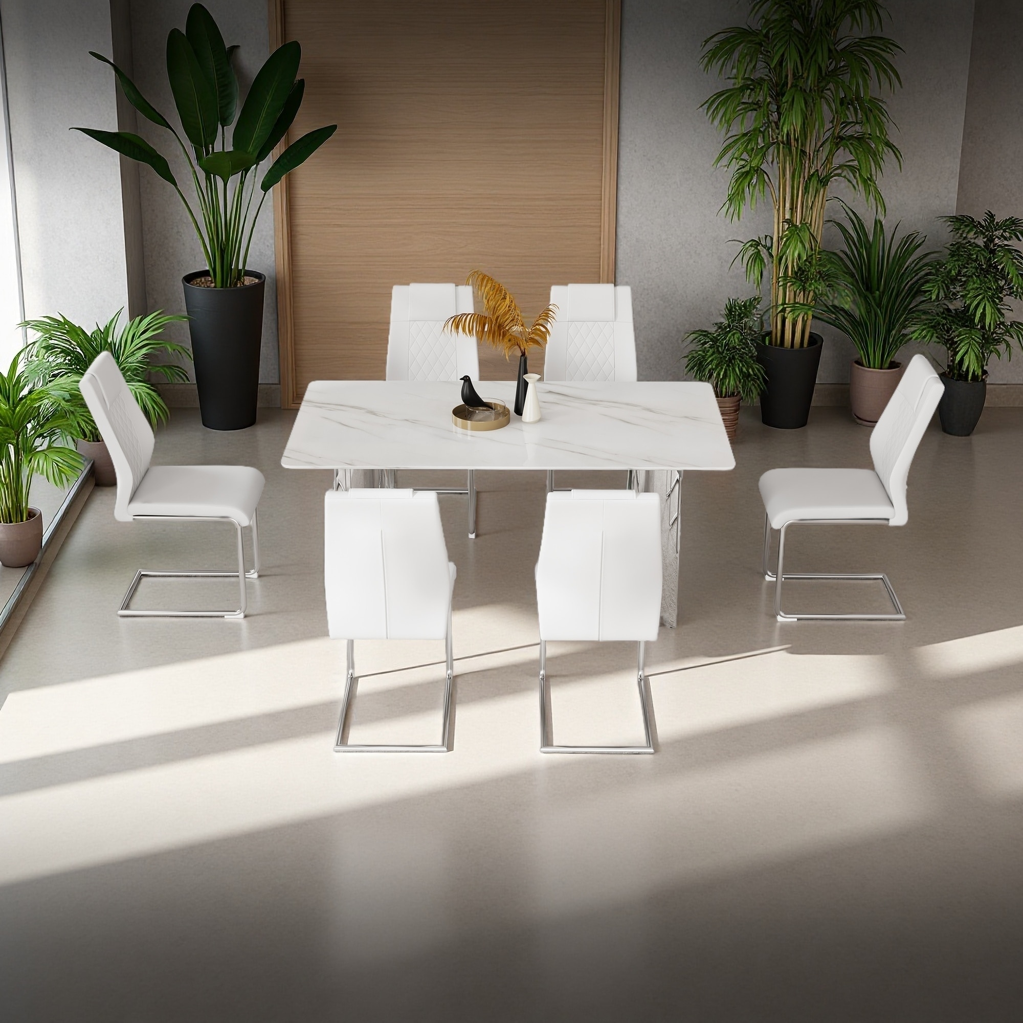 Modern Dining Table and Chair Set, Marble-Style Glass Top with Stainless Steel Legs & Comfortable PU Seats