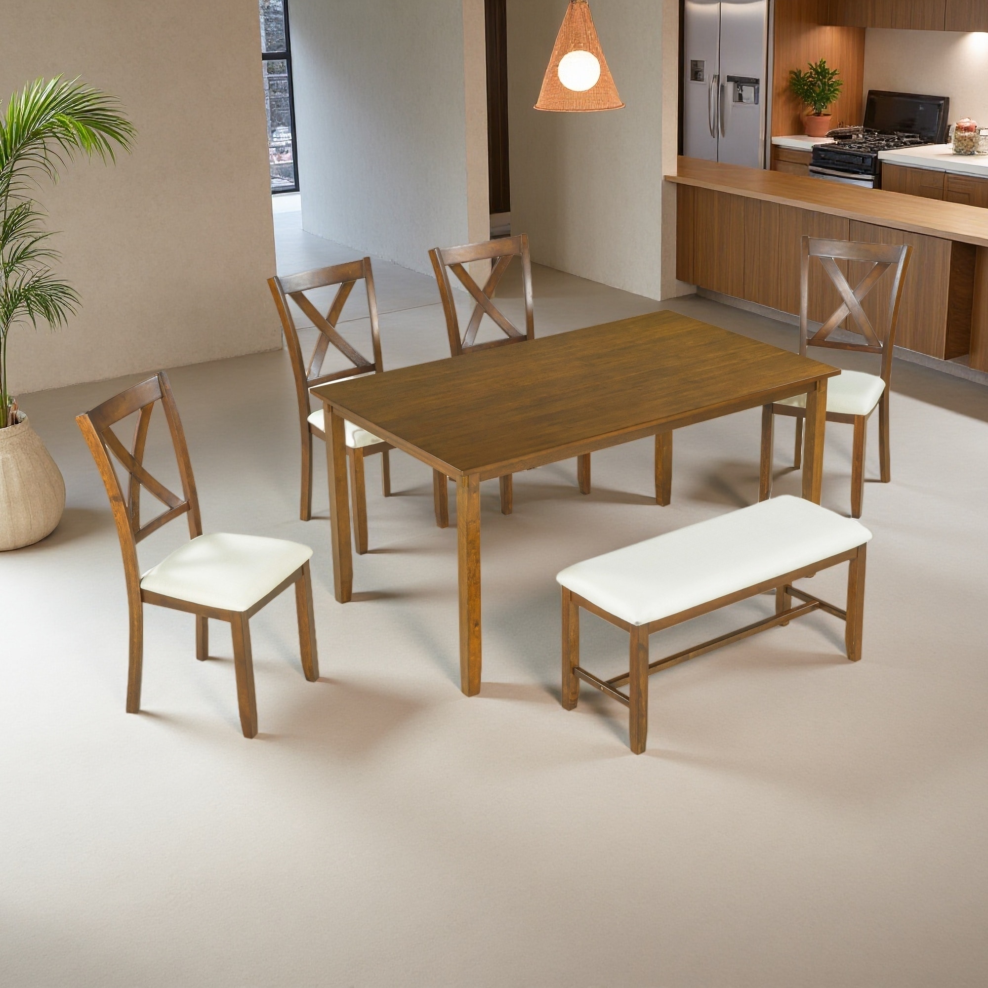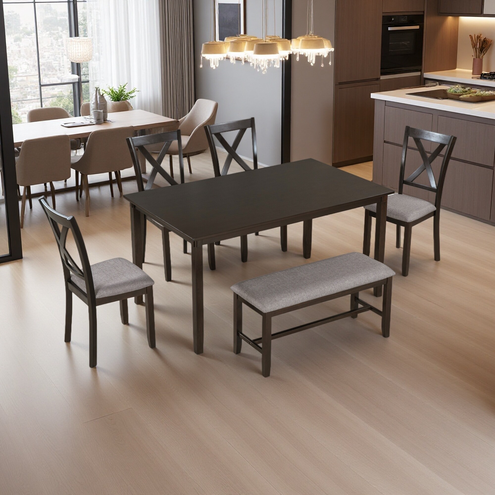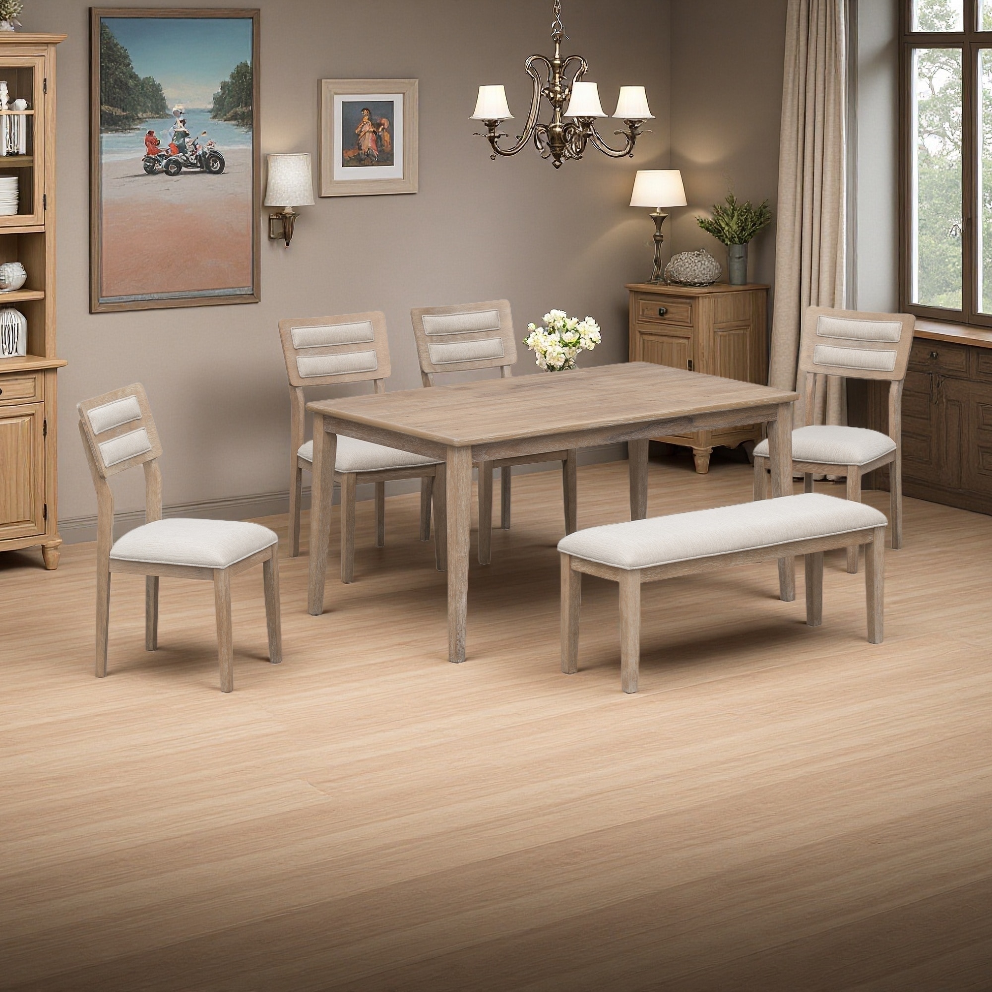 Classic 6-Piece Dining Set, Dining Table with 4 Upholstered Chairs & Bench, Traditional Style
