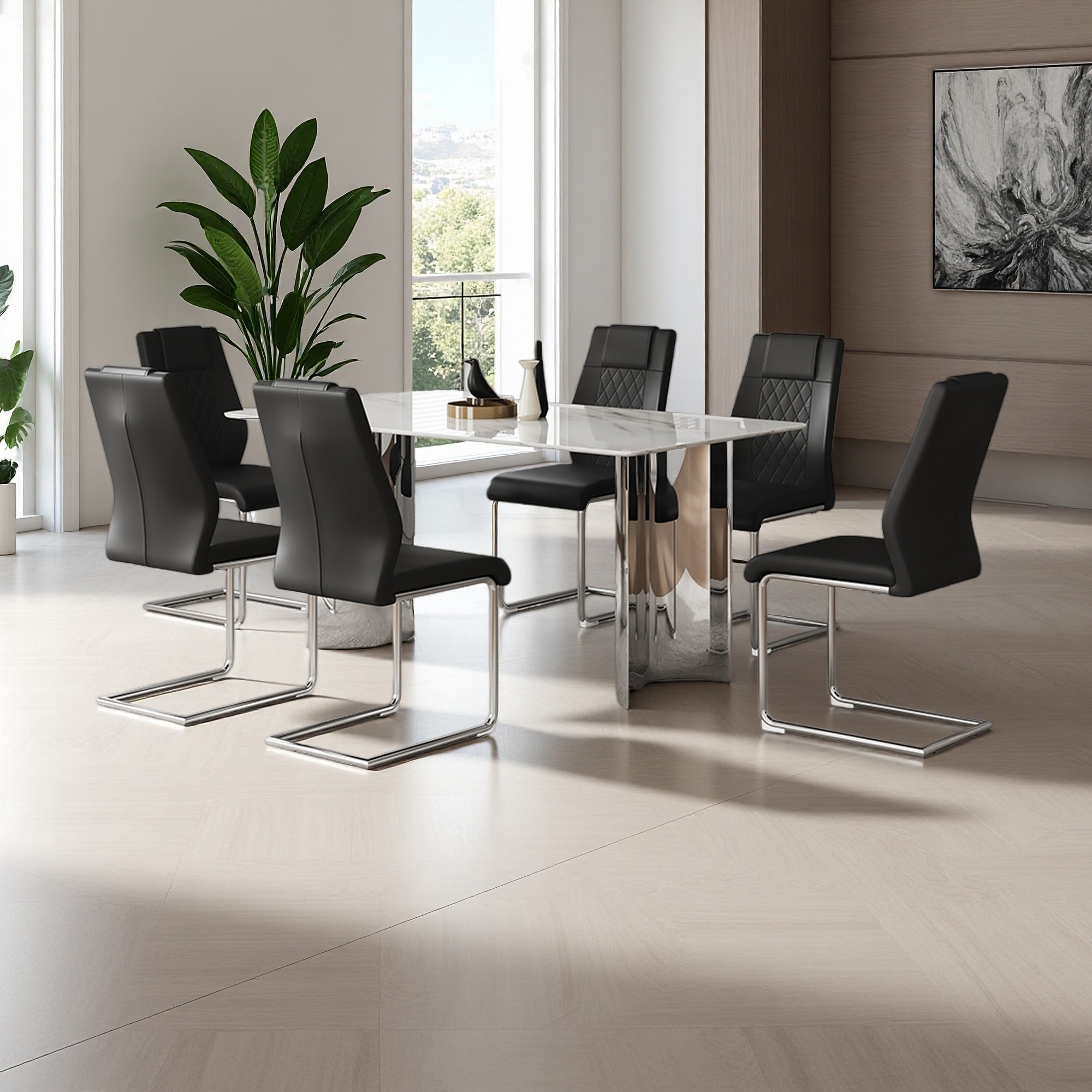 Modern Dining Table and Chair Set, Marble-Style Glass Top with Stainless Steel Legs & Comfortable PU Seats