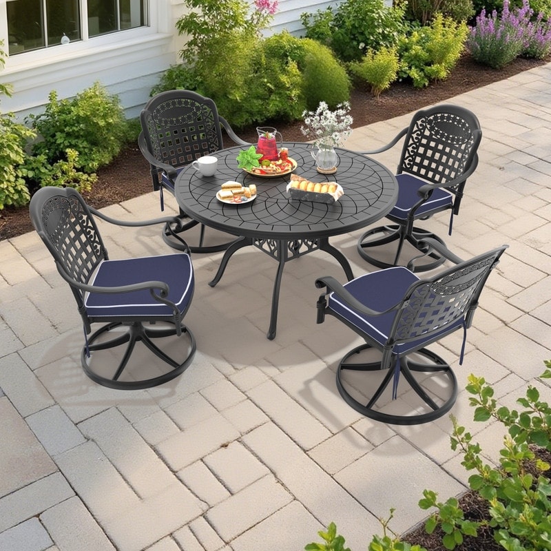 5-Piece Aluminum Round Outdoor Patio Dining Set, 4 Cushioned Swivel Chairs, Table, All-Weather Frames