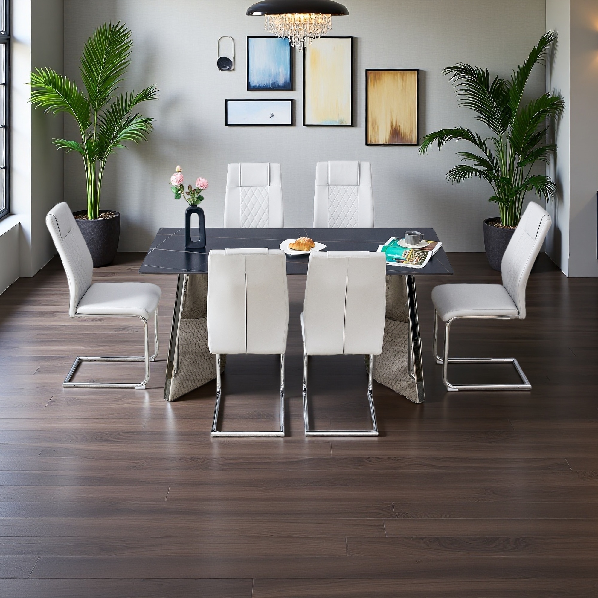 63"x31.5"x30" Marble-Pattern Table with Stainless Steel Butterfly Legs, Paired with 6 PU Chairs with Metal Legs