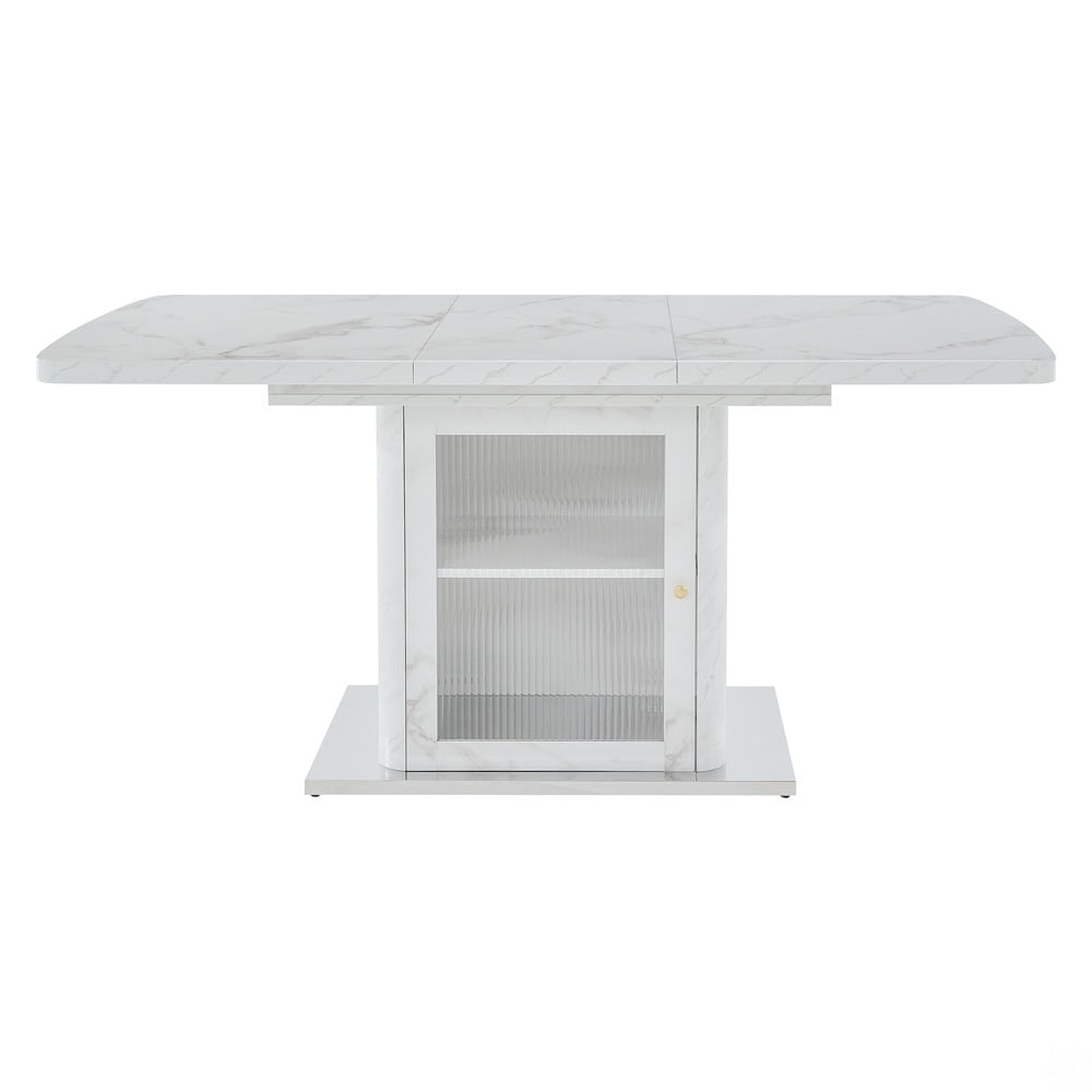 Modern Stretchable Square Dining Table with Printed White Marble Table Top and Storage Cabinet Table Leg