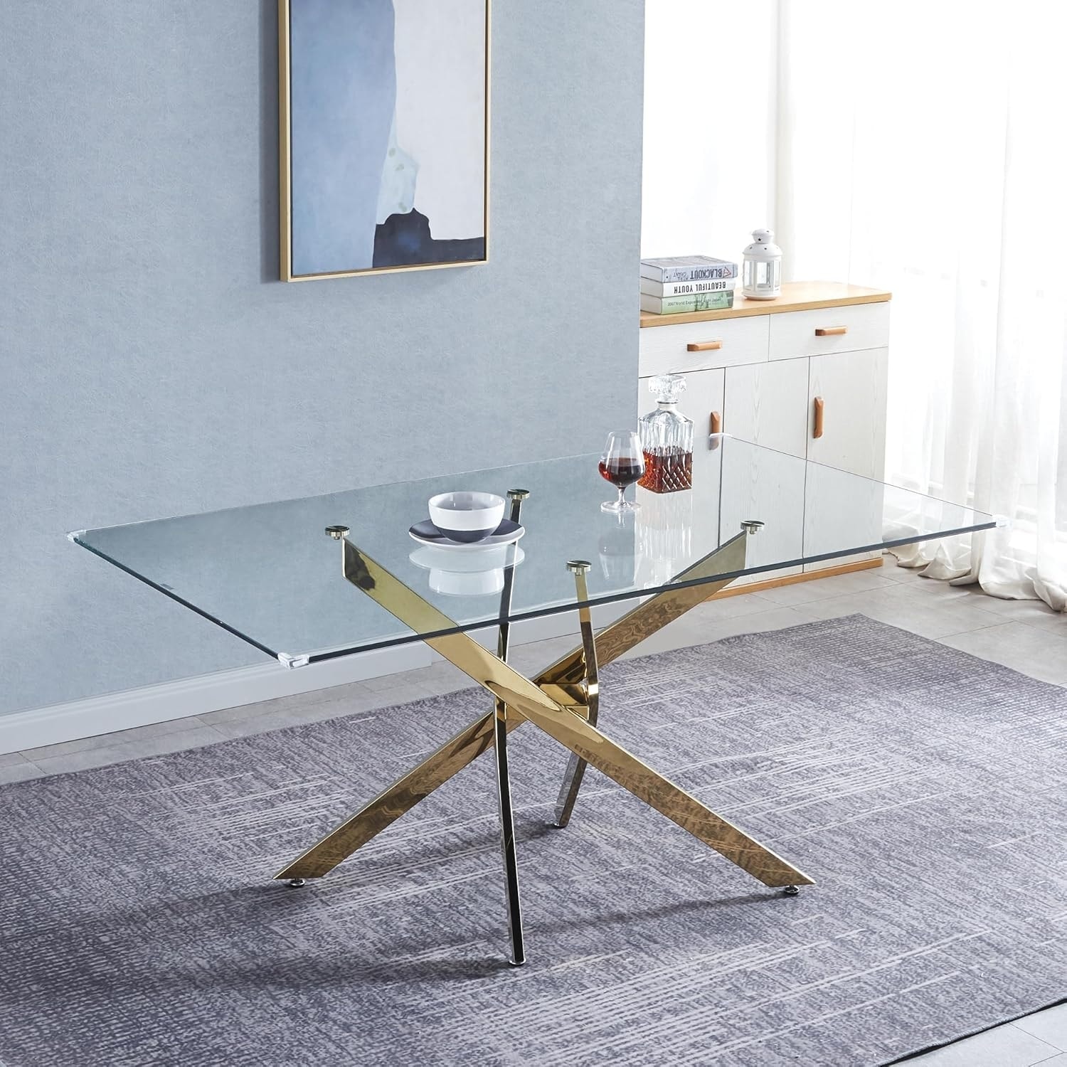 63 Inch Rectangular Tempered Glass Dining Table with Gold Stainless Steel Legs, Seats 4-6