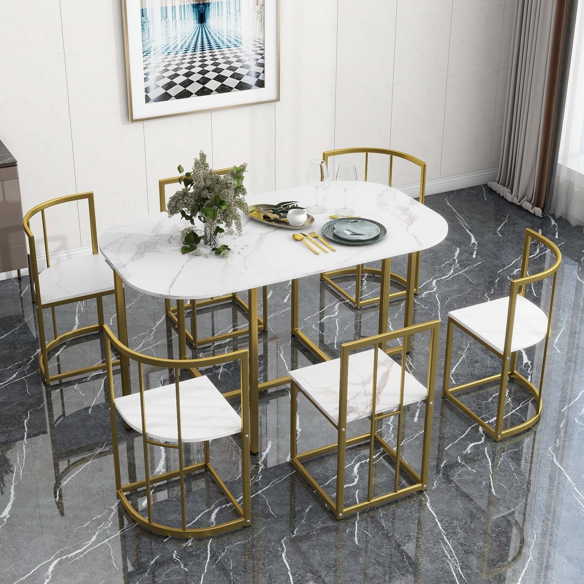 Modern 7-Piece Dining Table Set with Faux Marble Top for 6