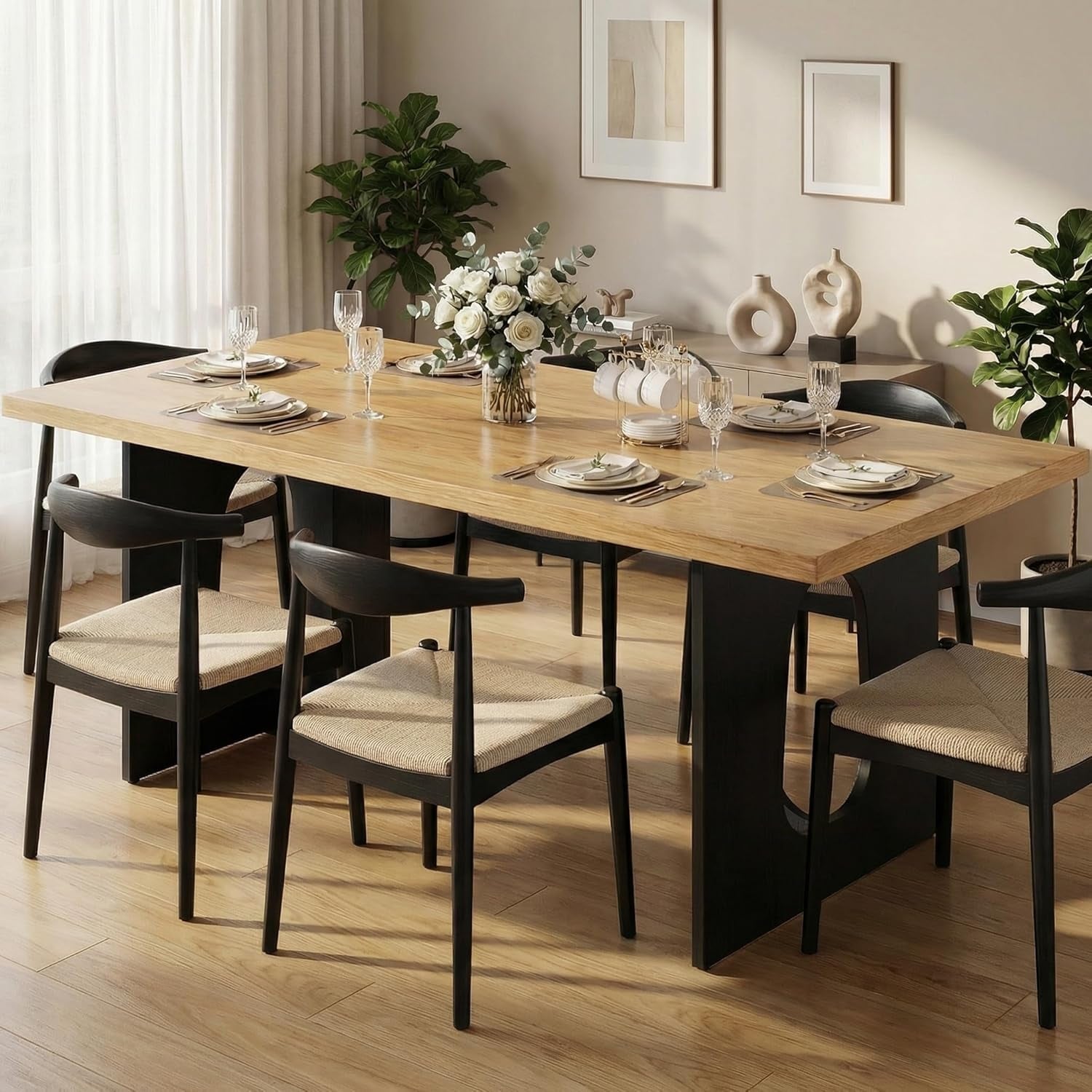 Wood Casual Dining Table for 6, Kitchen Rectangular Dining Table with Curved Table Corner Modern Minimalist Dining Table Desk