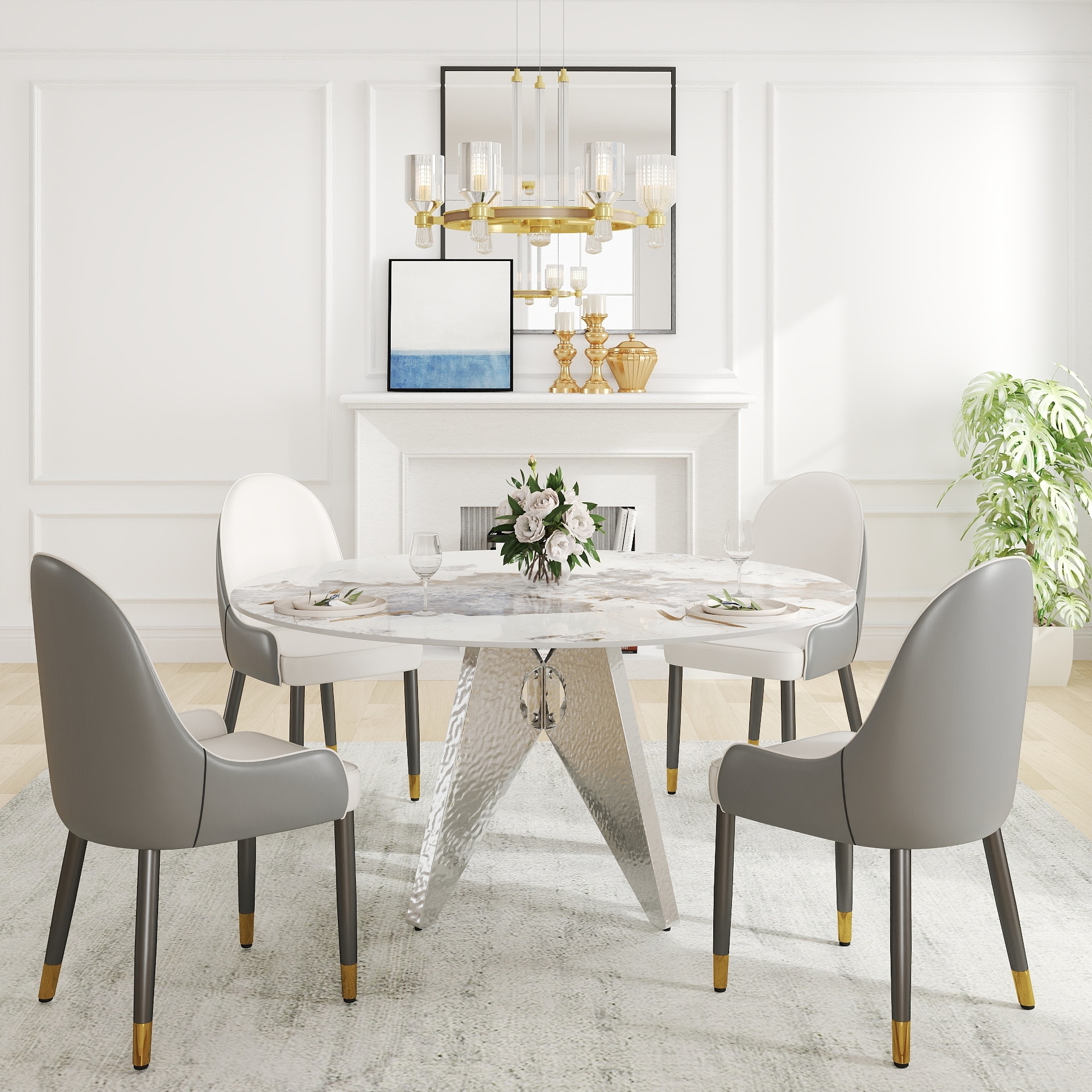 Modern Round Artificial Marble Dining Table with Silver Stainless Steel Design Base for 6-8 People(Dining Table Only)