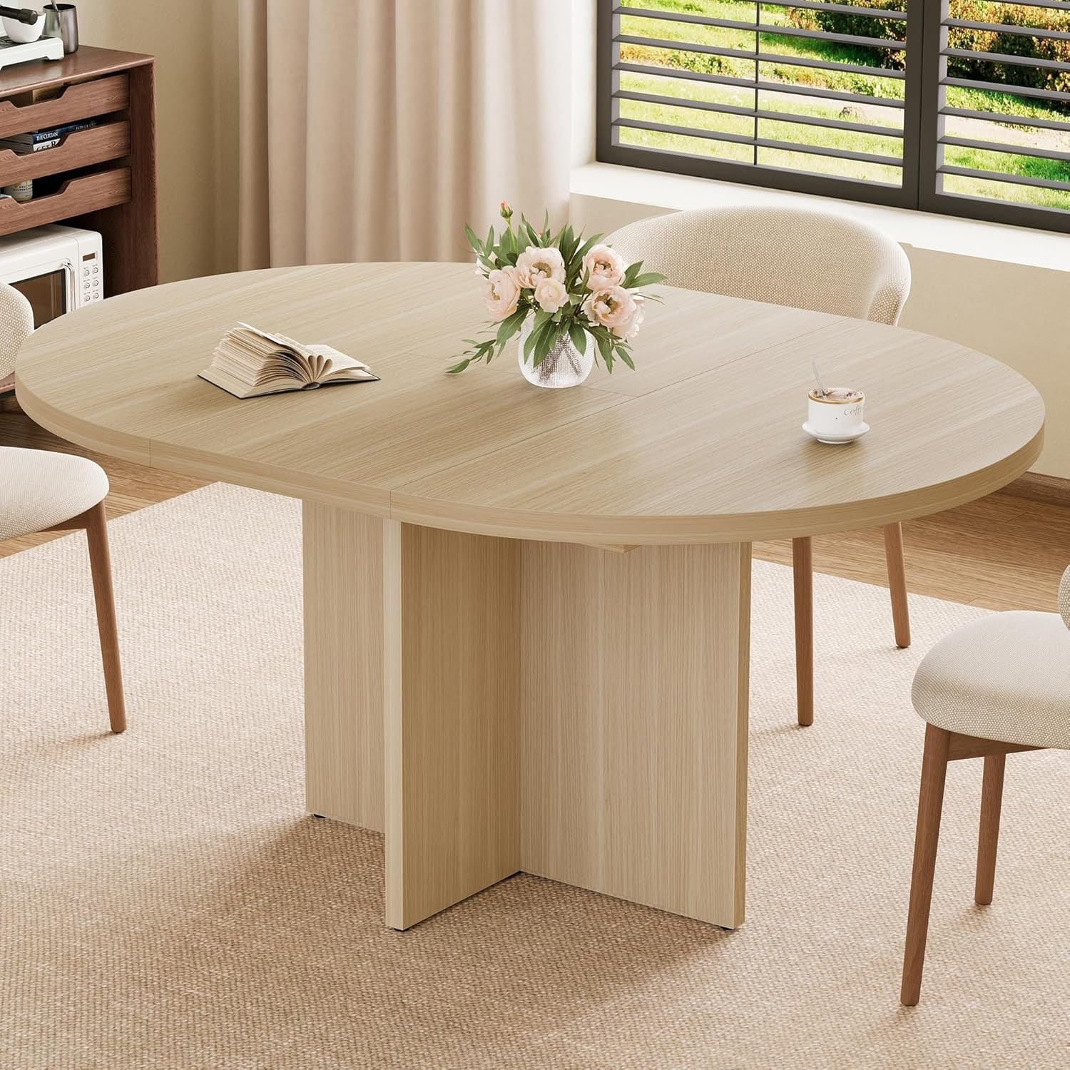 Modern Extendable Round Dining Table Seats 4-8 Natural Wood Removable Extension Leaf