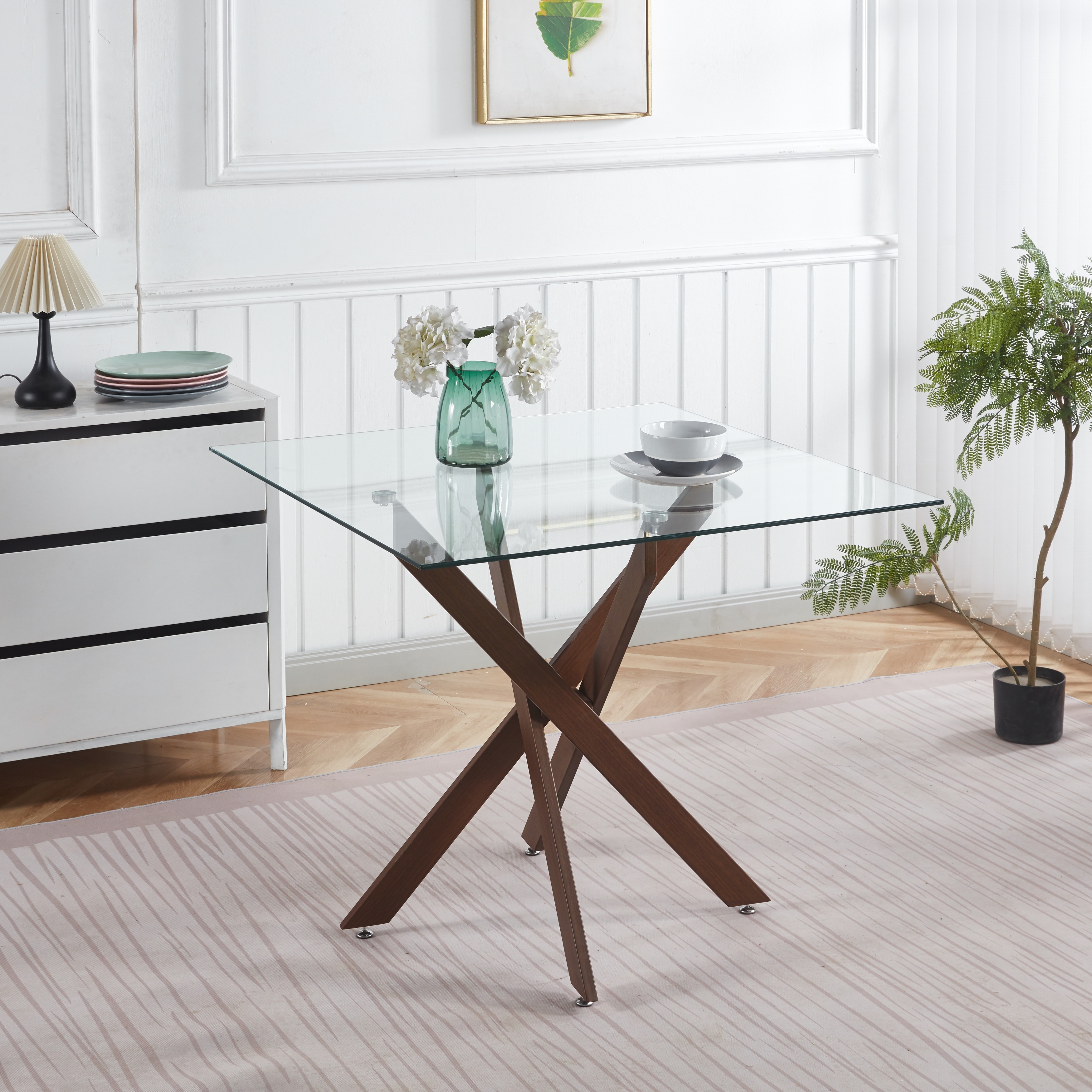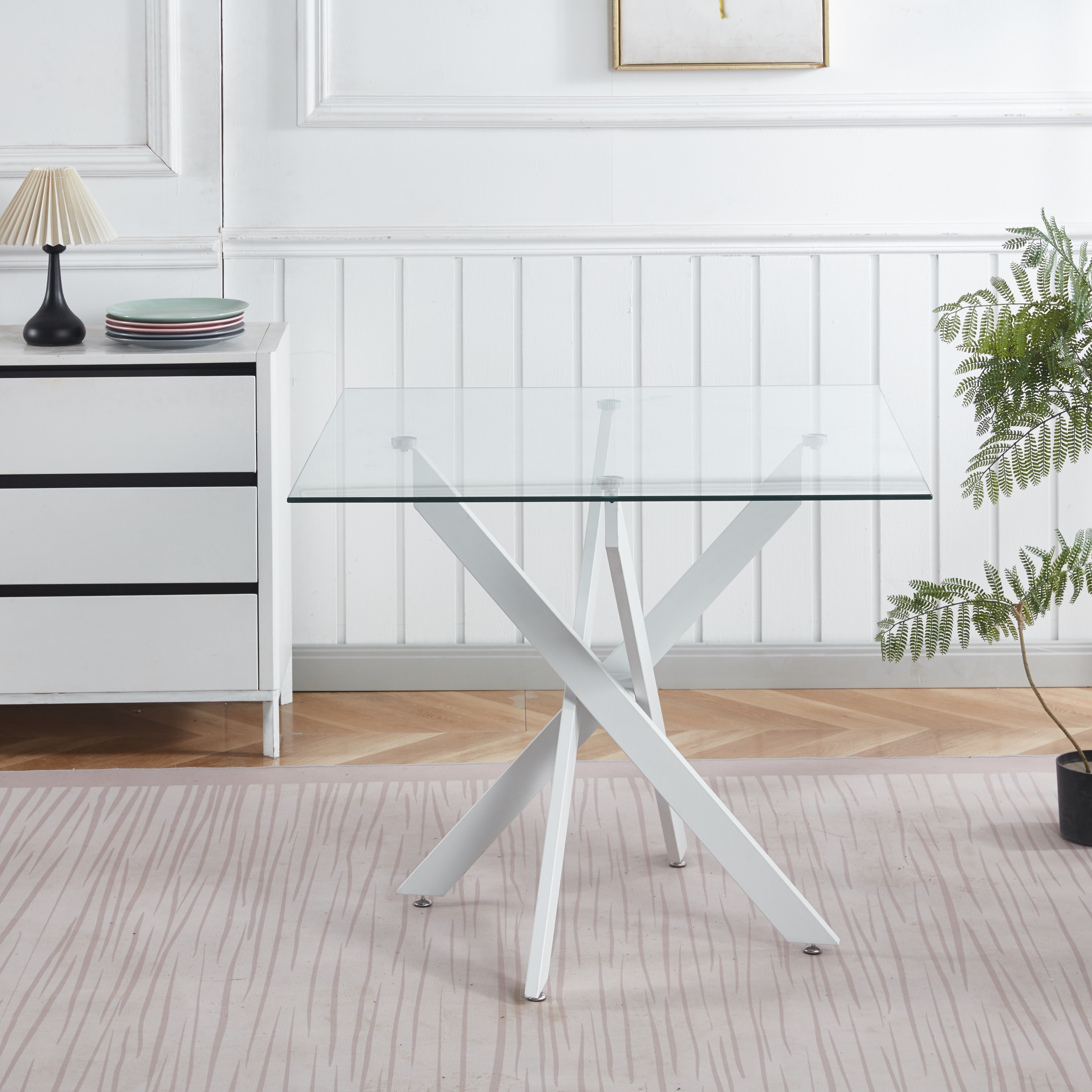 Square Glass Dining Table for 4 Person, Kitchen Table with Tempered Glass & Cross Metal Legs, Modern Leisure Coffee Table