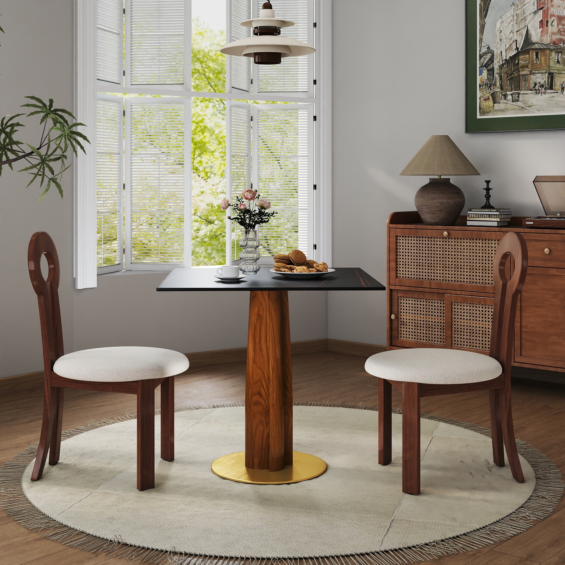 Modern Square Dining Table, 33.5" Sintered Stone Table with Wooden Leg & Gold Base, 2 - Person Kitchen Table for Small Space