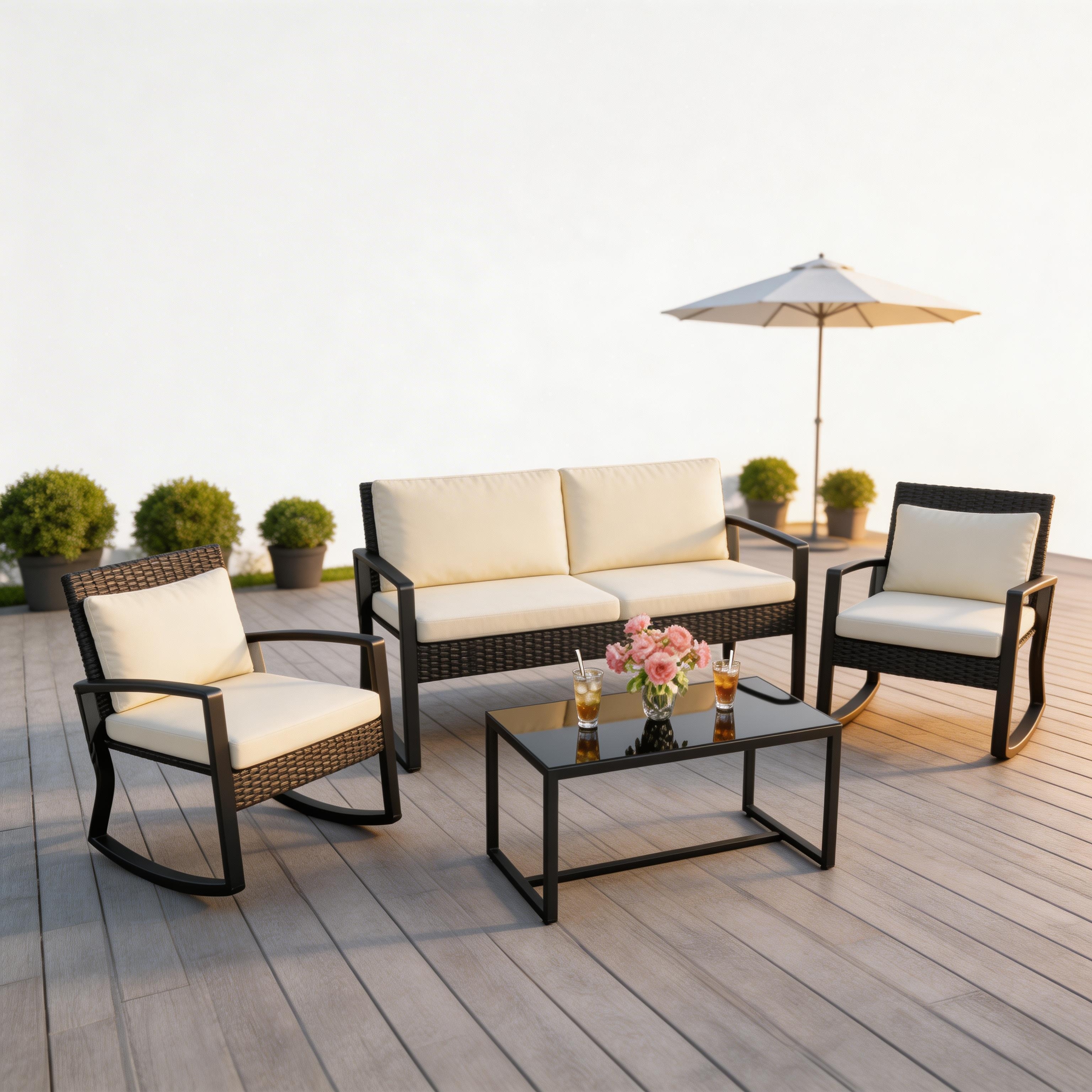 4-Piece Rattan Rocking Chair Set, Outdoor Wicker Patio Rocker Conversation Set