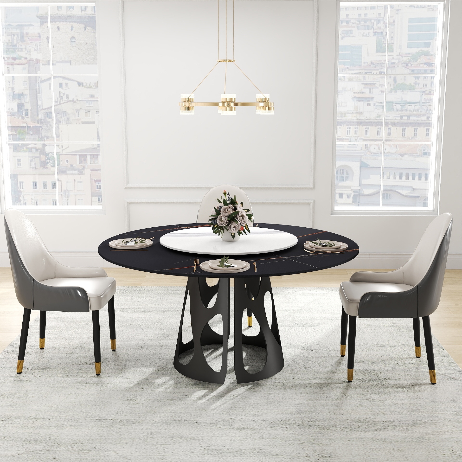 Modern Round Artificial Marble Dining Table with Black Iron Metal Base & Artificial Stone Turntable(Dining Table Only)