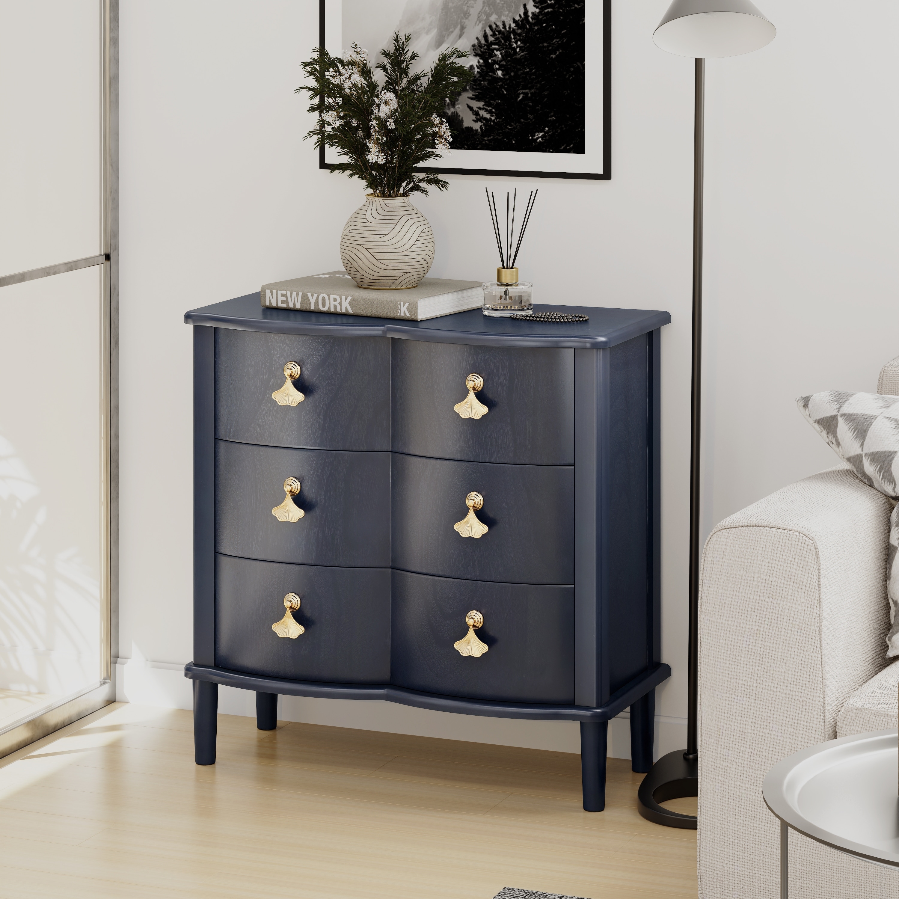 COZAYH Dark Blue 3-Drawer Dresser with Gold Leaf Handles, Vintage Curved Front