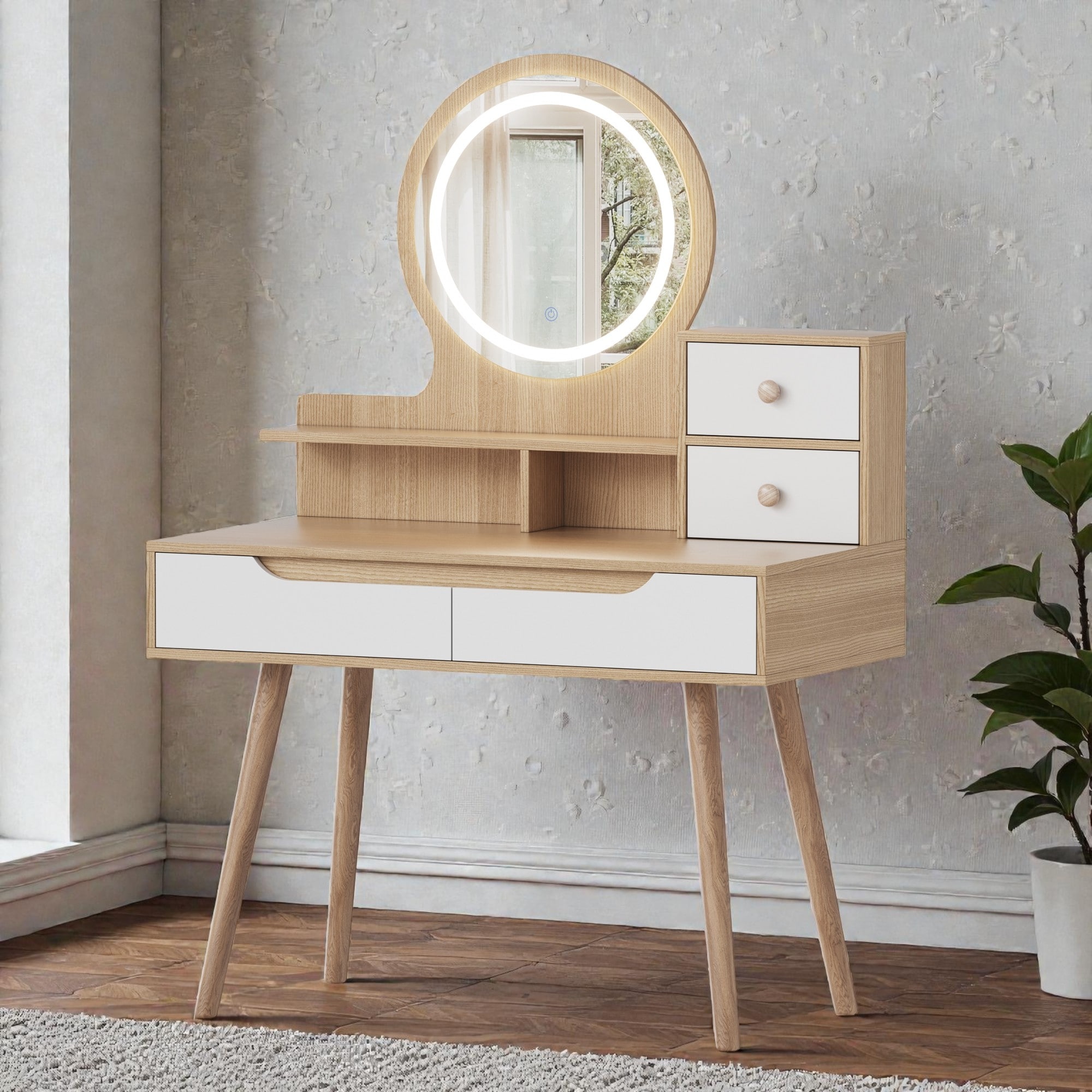 Makeup Vanity Desk with Lighted Mirror, Dressing Table with Storage Drawers and Open Shelves for Small Space Bedroom