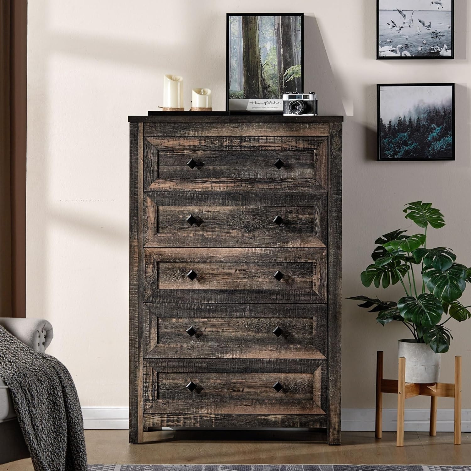 5 Drawer Tall Dresser, Farmhouse Style, Dark Oak, Multi-Use Cabinet for Bedroom, Living Room, Hallway