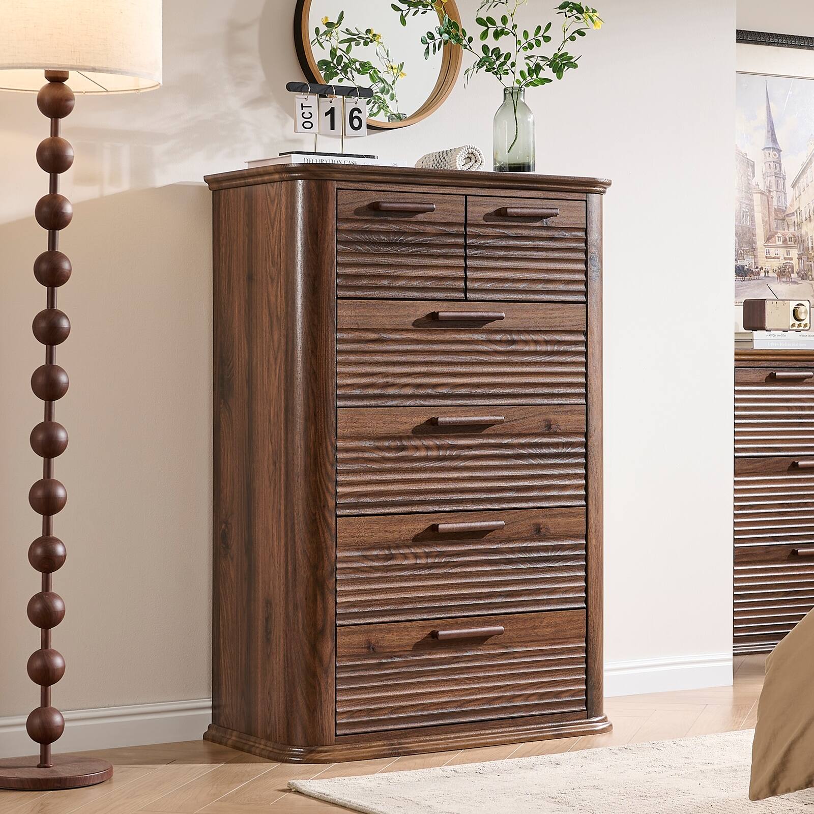 45" Tall 6 Drawers Dresser with Curved Profile Design, Wood Fluted Chest of Drawer