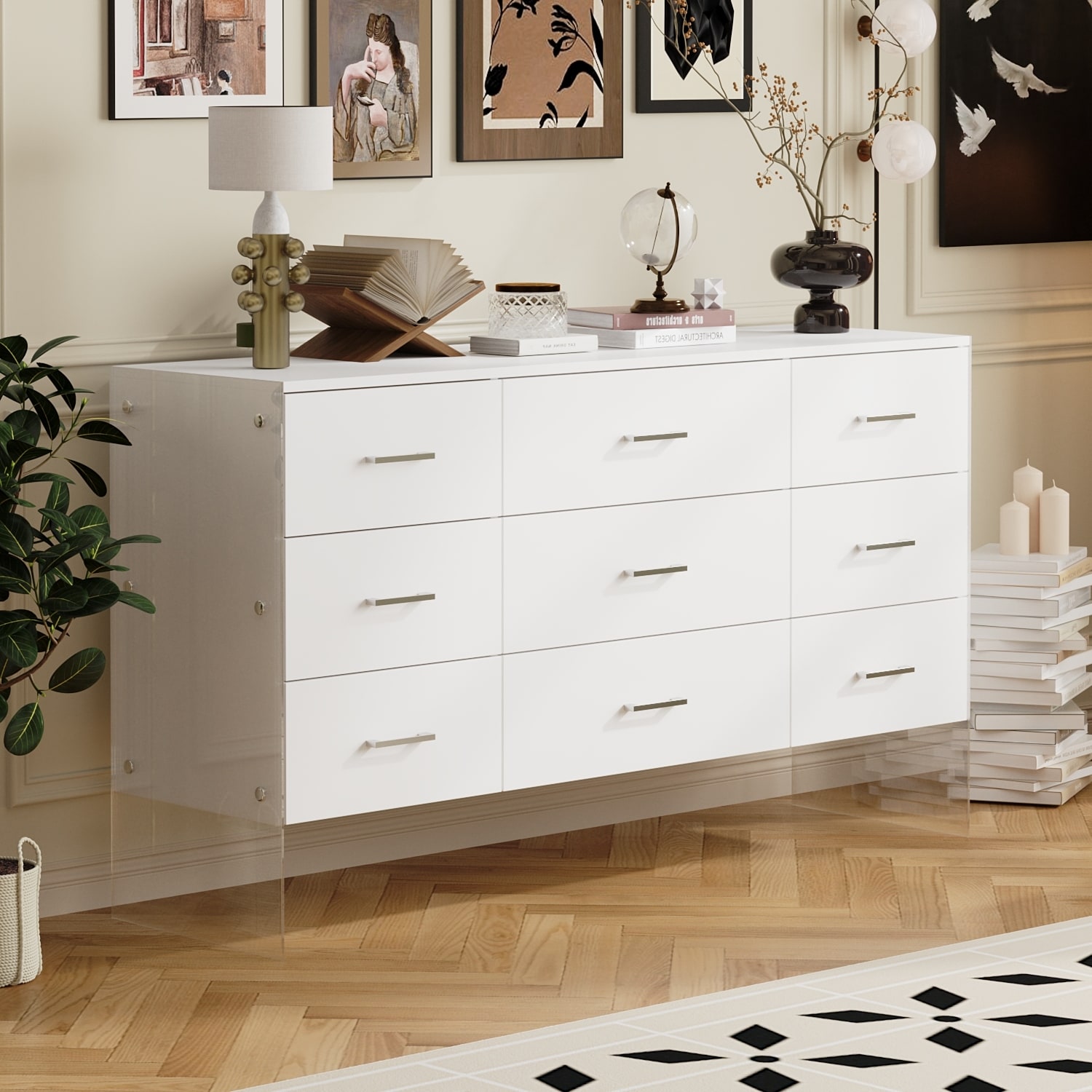 Dresser Chest of 9 Drawers Triple Dresser with Glass Legs White