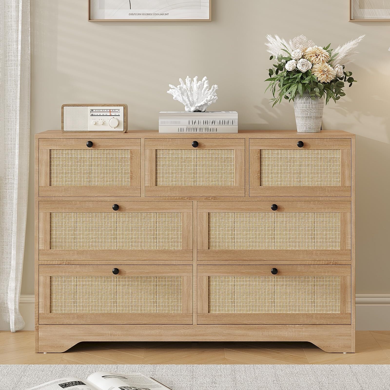 Rattan 7 Drawer Dresser for Bedroom, Farmhouse Modern Dressers & Chests