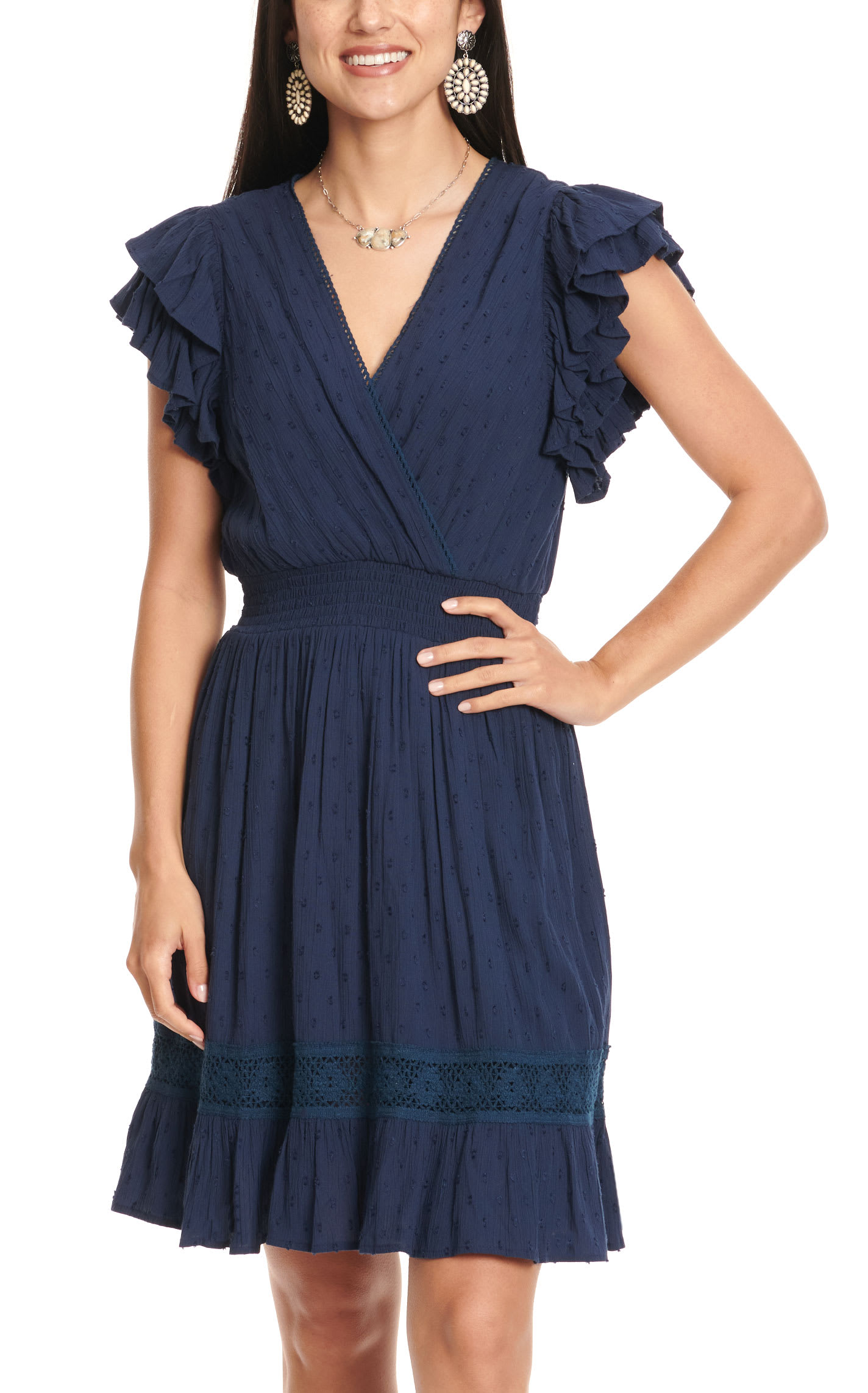 Rockin' C Women's Navy Swiss Dot V-Neck Short Flutter Sleeve Dress - M - From Cavender's