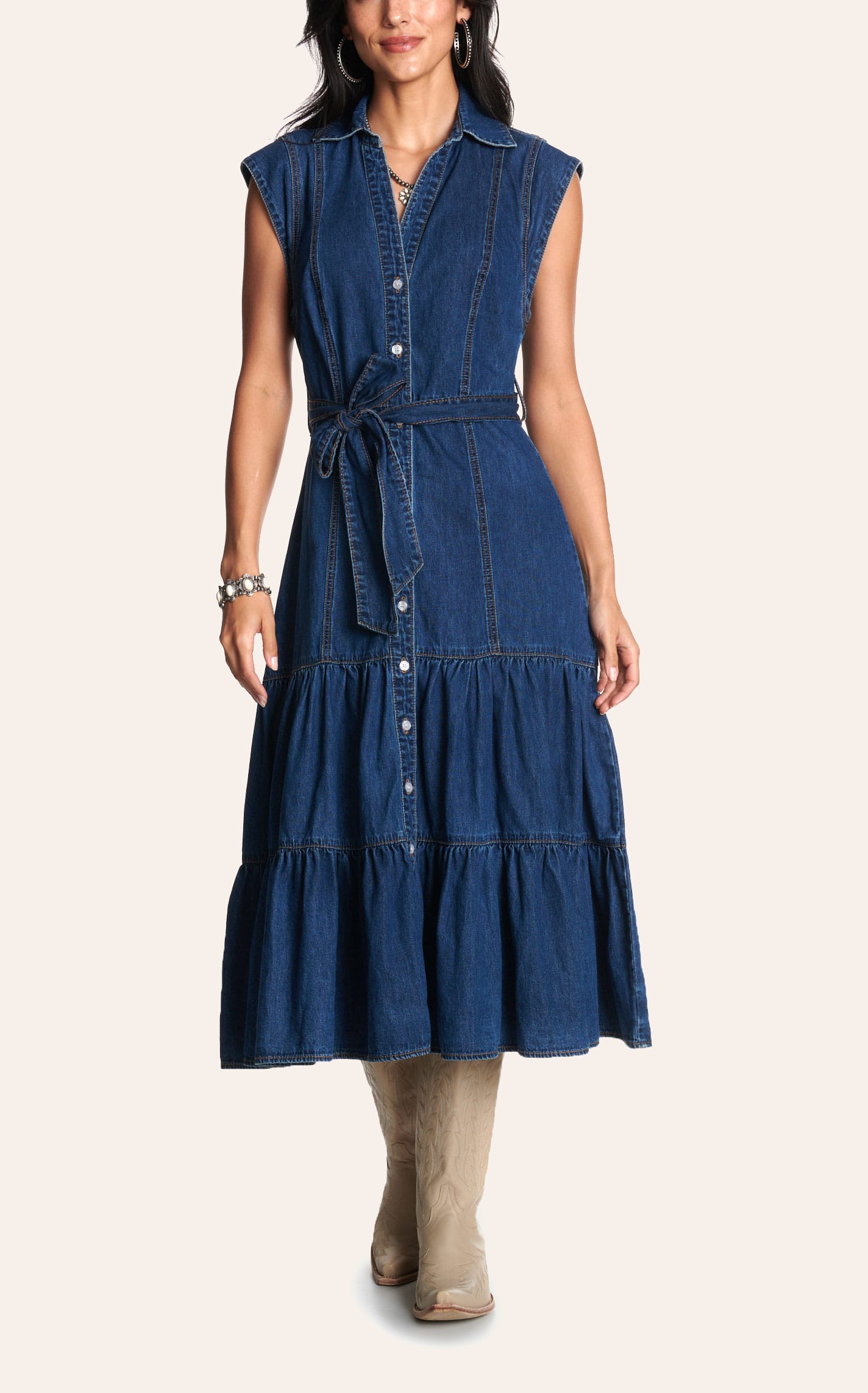 Rockin C Women's Dark Wash Sleeveless Tiered Denim Midi Dress - S - From Cavender's
