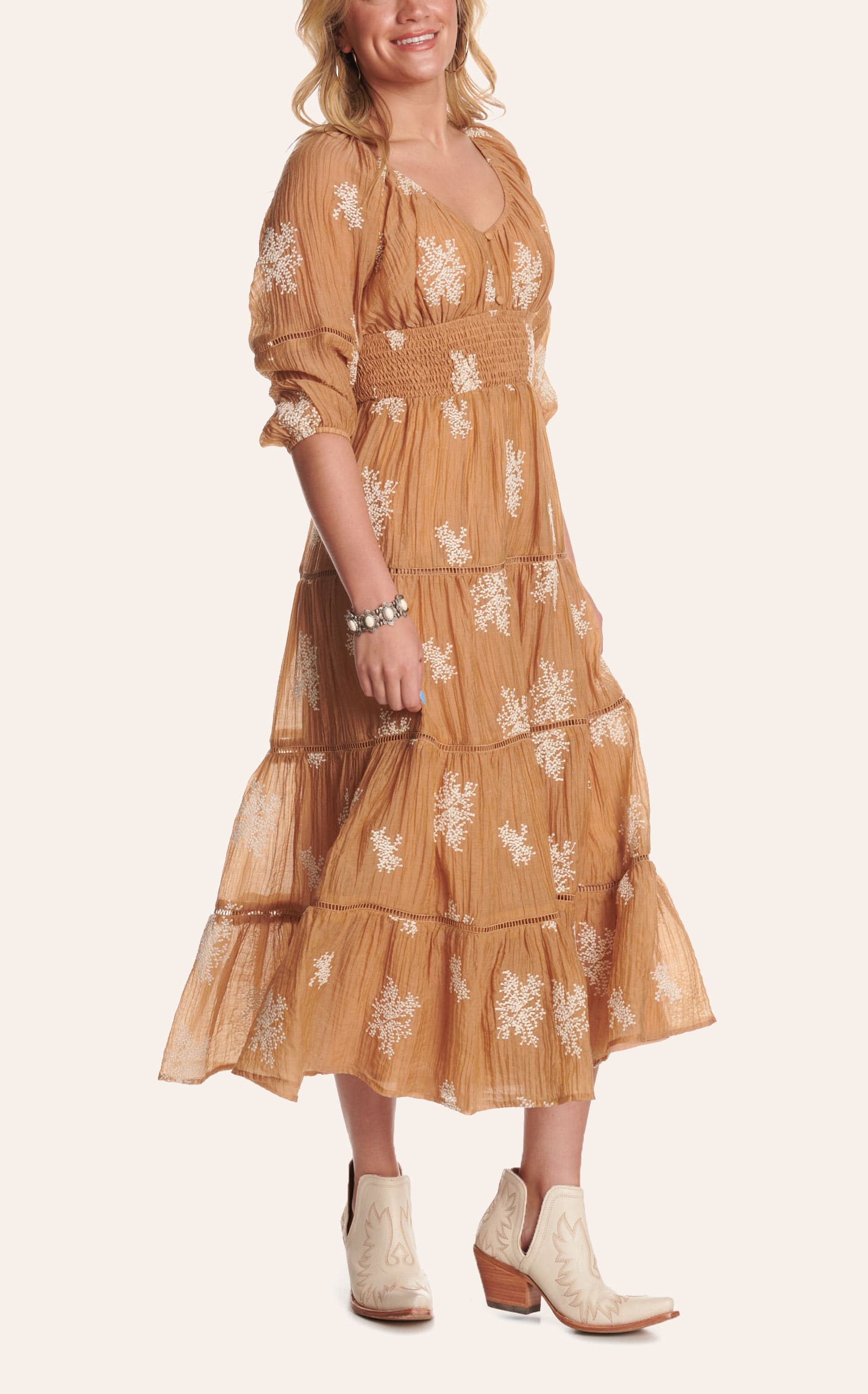 Endless Blu Natural Smocked Floral Embroidered Maxi Dress - L - From Cavender's - Women's