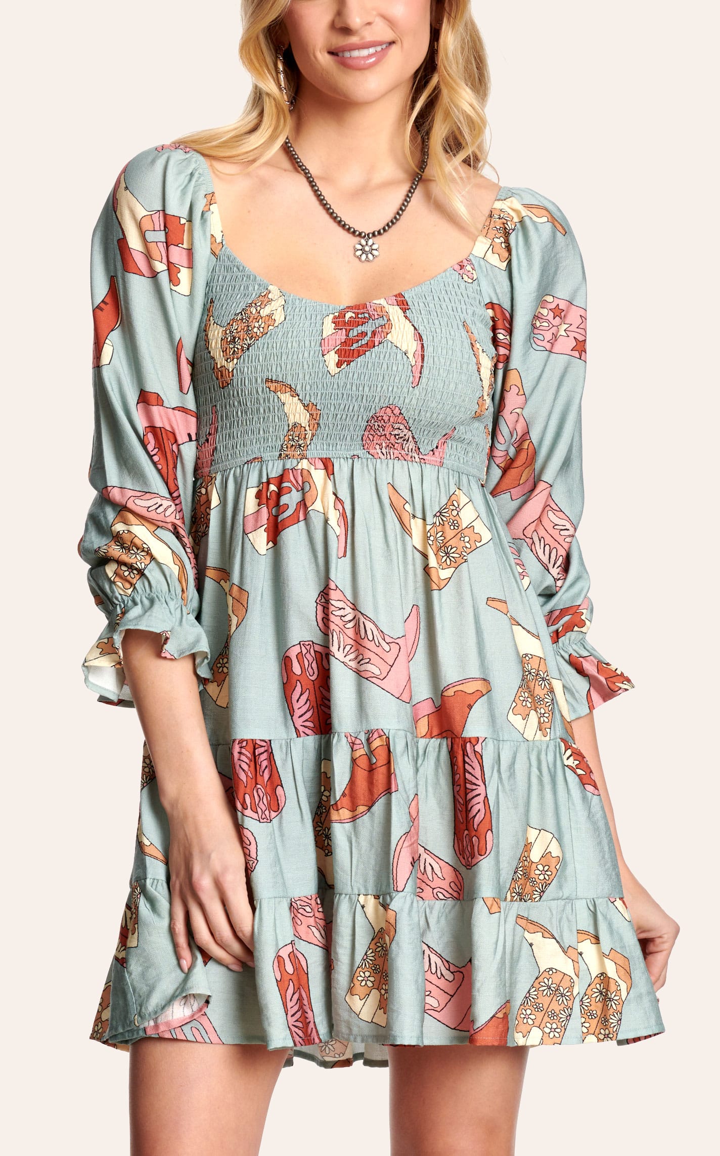 Rockin C Women's Aqua Marine Boot Print Smocked Dress - M - From Cavender's