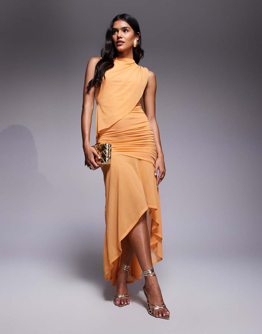 ASOS DESIGN ruched maxi dress with high low hem in apricot-Orange