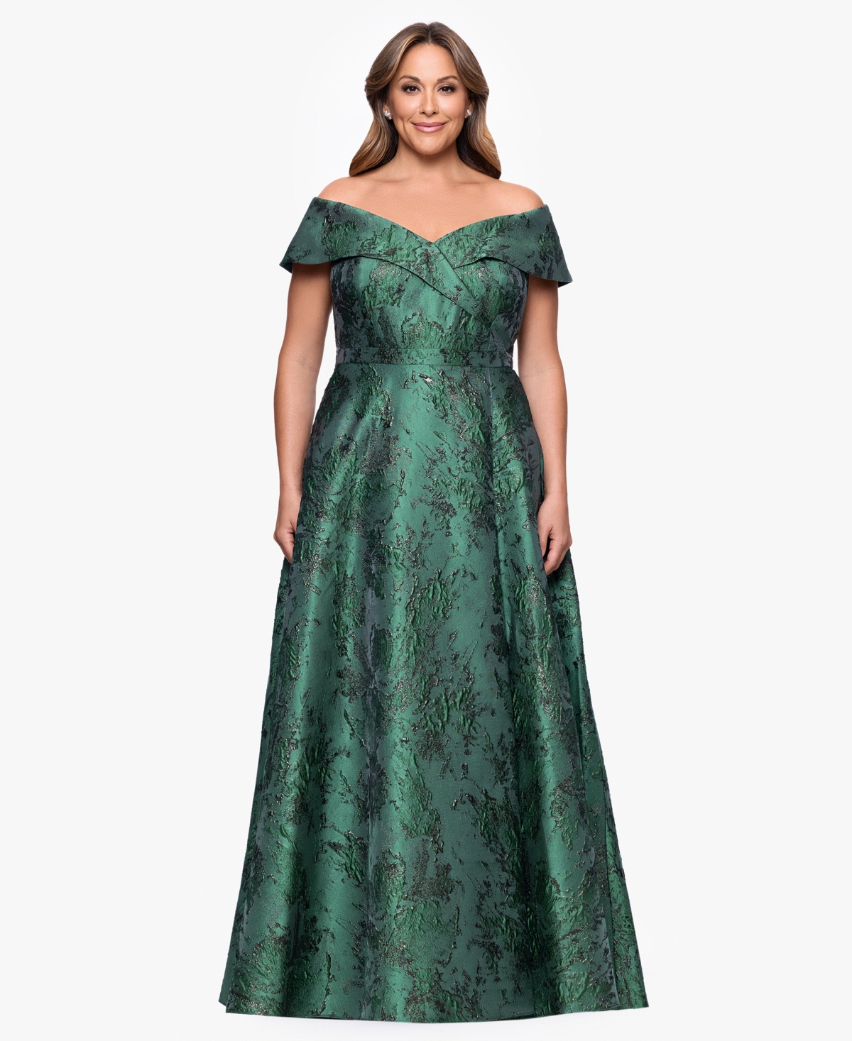 Xscape Plus Size Off-The-Shoulder Metallic Jacquard Ball Gown - Dark Green