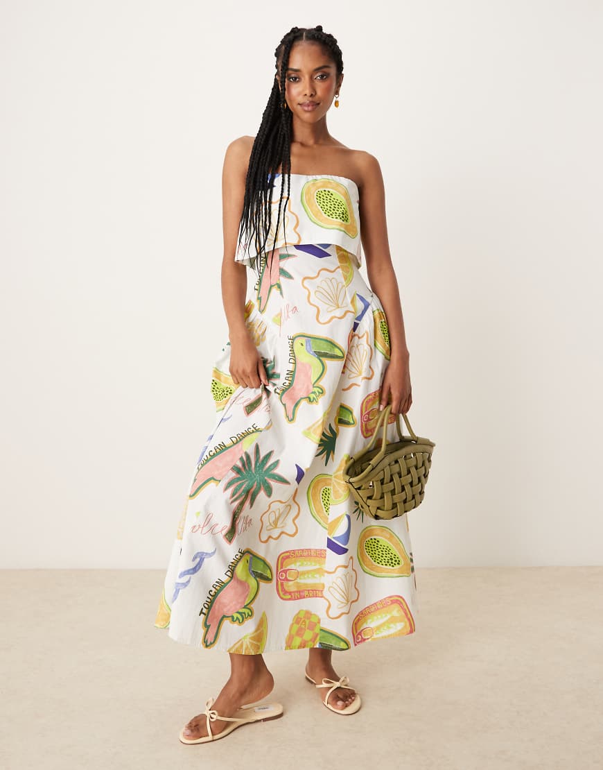 ASOS DESIGN fold over bandeau midi dress with godets in tropical conversational print-Multi