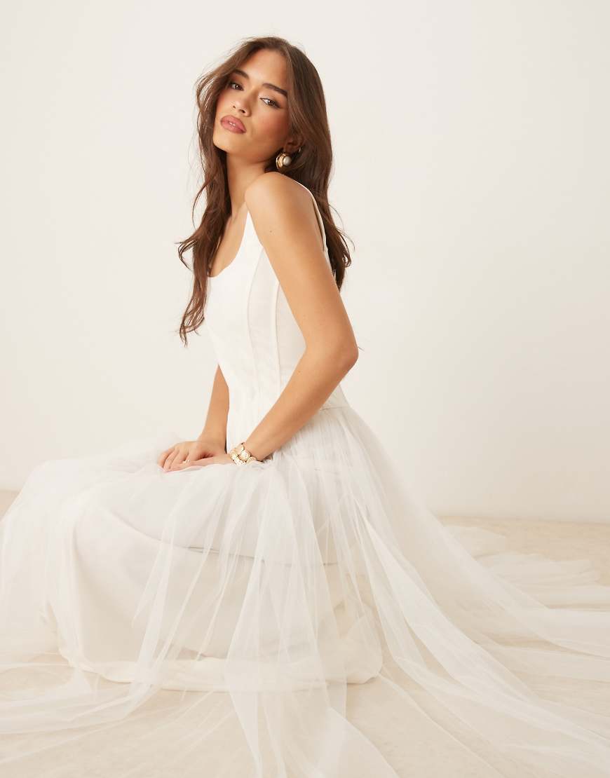 Lace & Beads corset tulle drop hem maxi dress in ivory-White