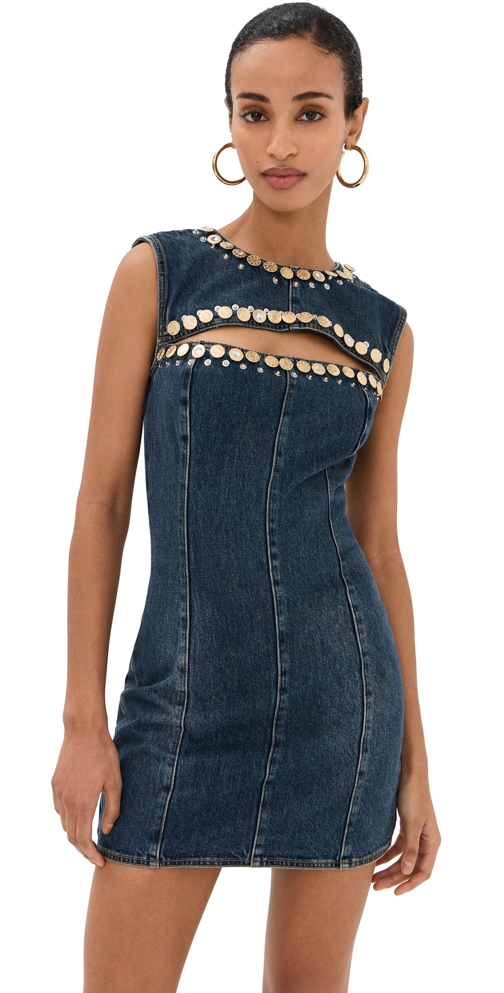 Area Crystal Button Studded Slit Mini Dress Dark Blue Wash