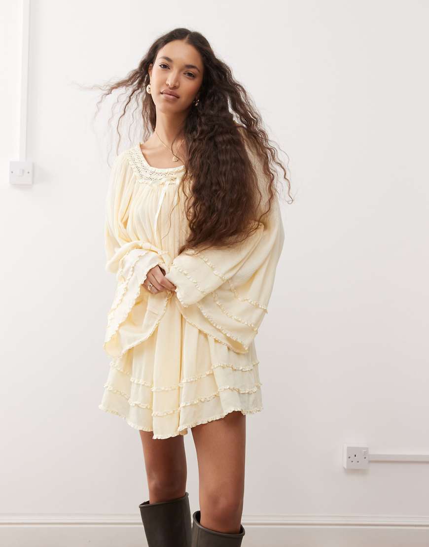 Miss Selfridge volume sleeve mini smock dress in buttermilk-Neutral