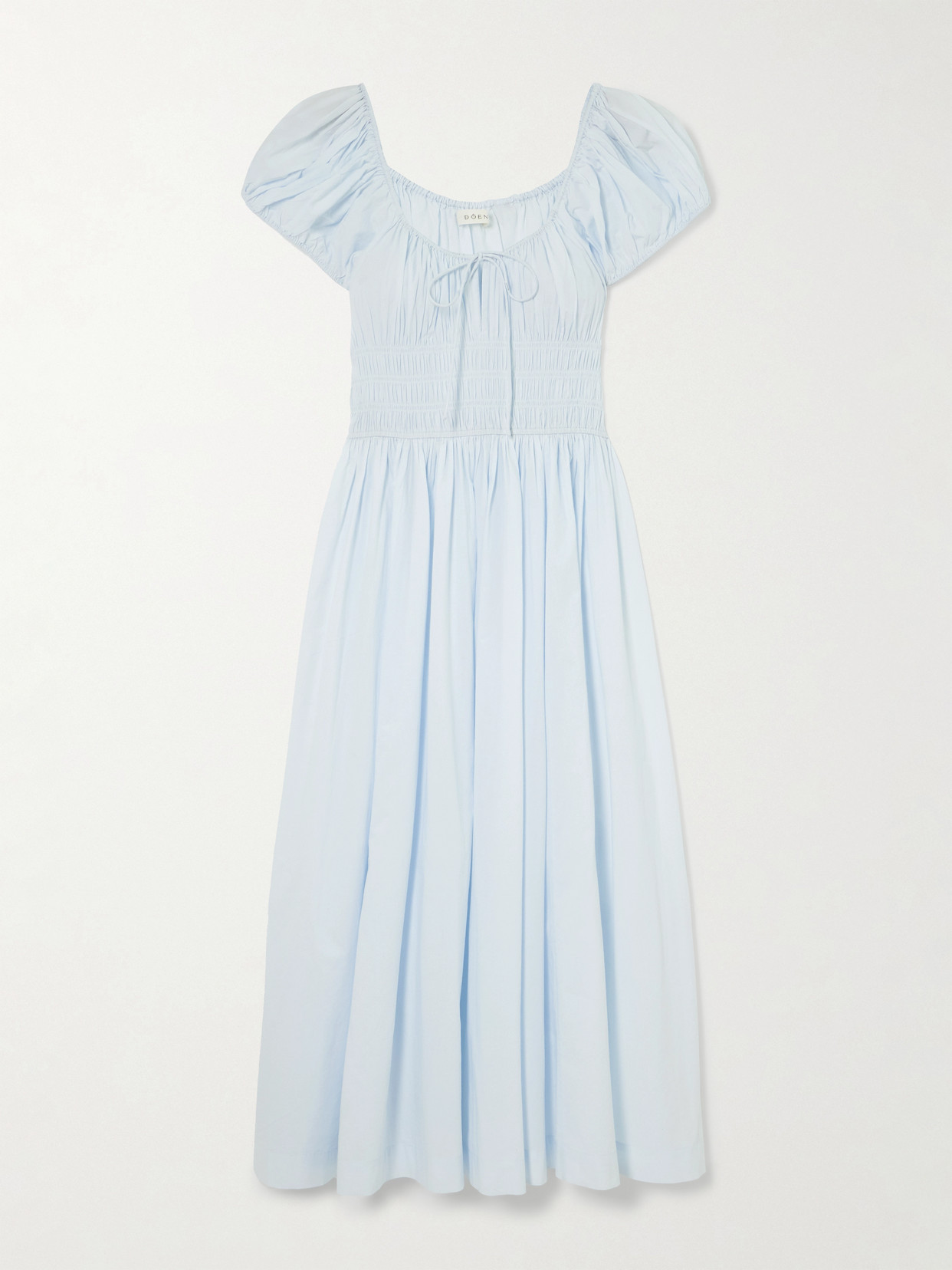 DÔEN Quinn Tie-detailed Shirred Organic Cotton-poplin Midi Dress - Blue