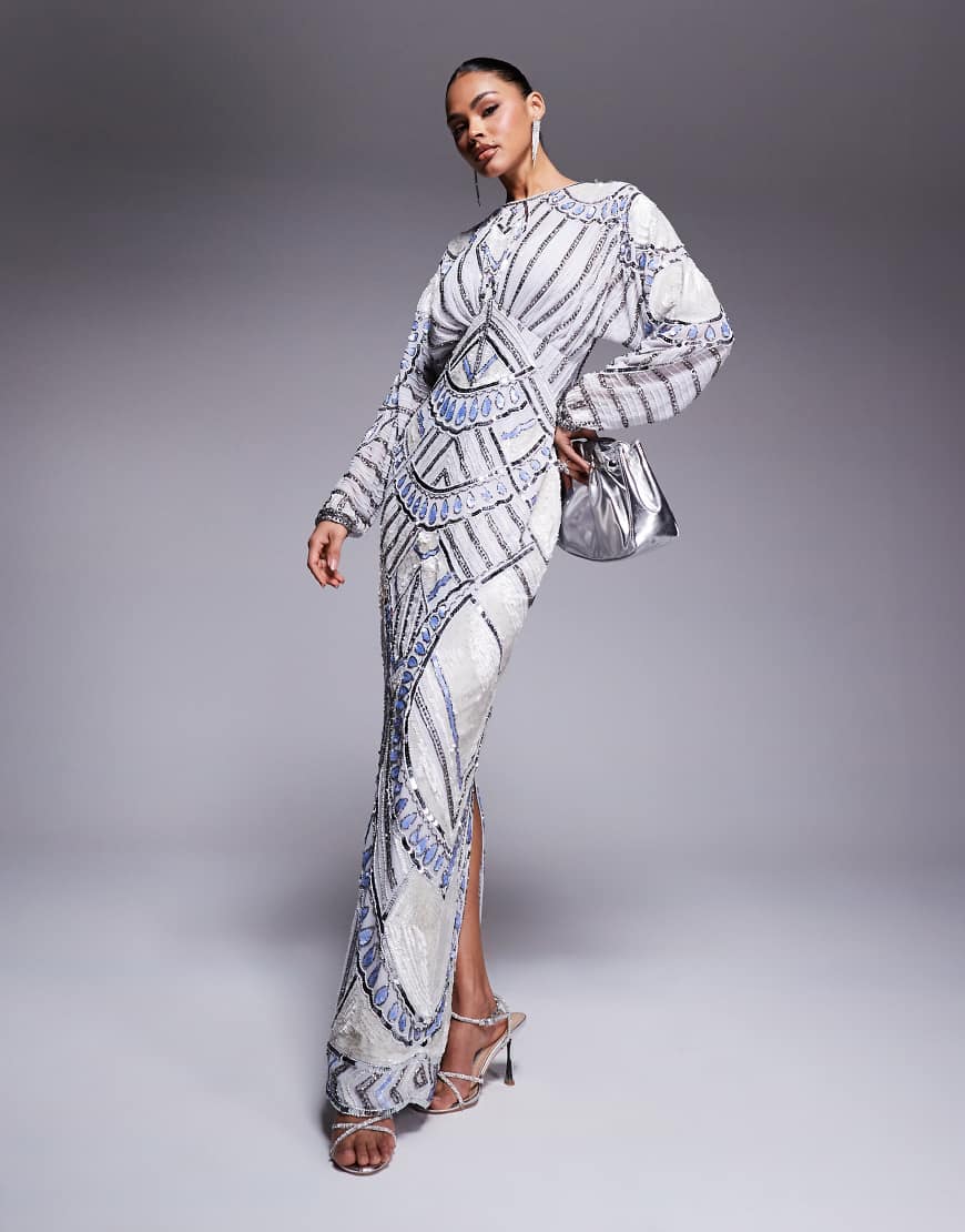 ASOS DESIGN embellished batwing maxi dress in pale blue-White