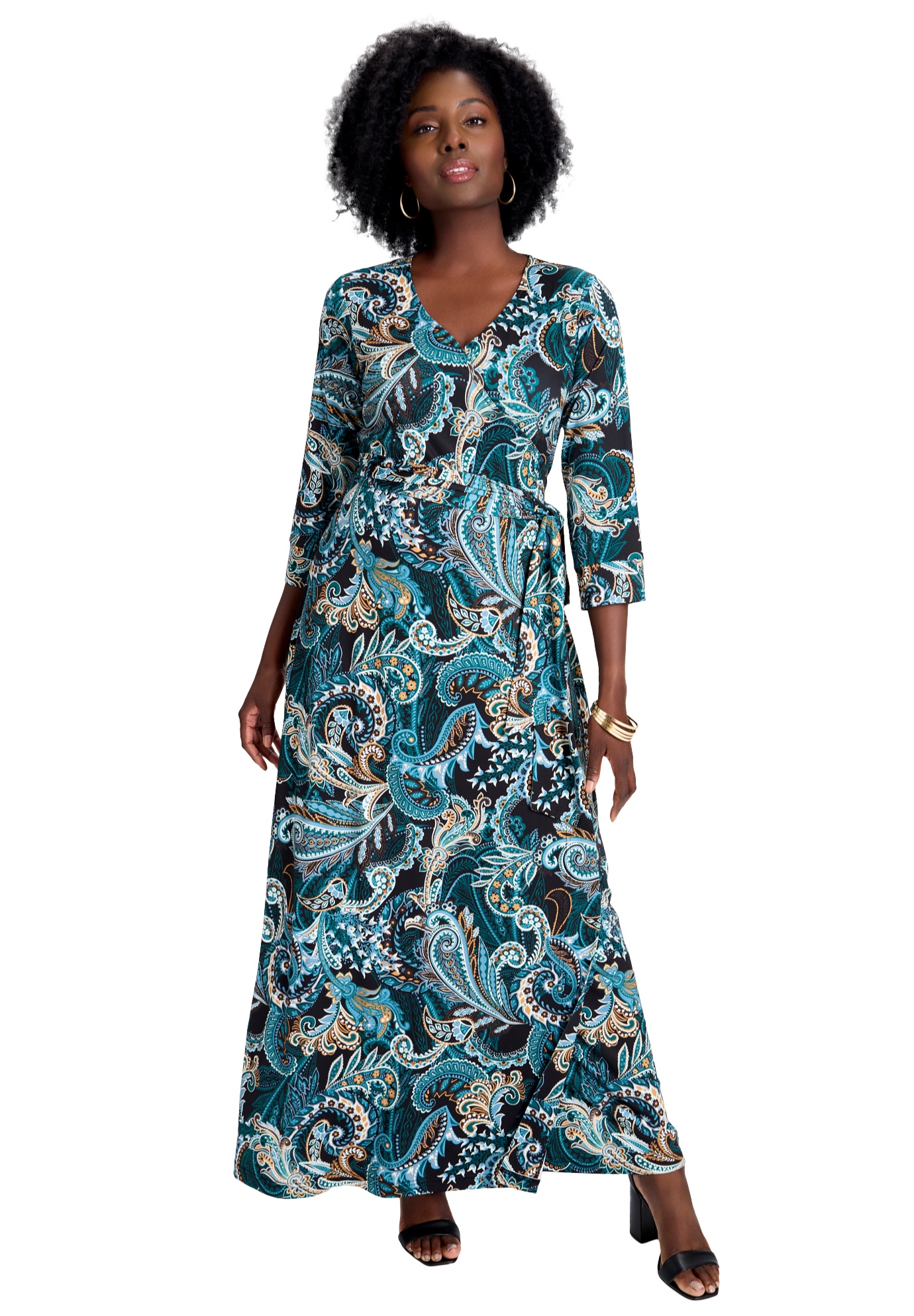 Plus Size Women's Stretch Knit Faux Wrap Maxi Dress by The London Collection in Frost Teal Paisley (Size 22 W)