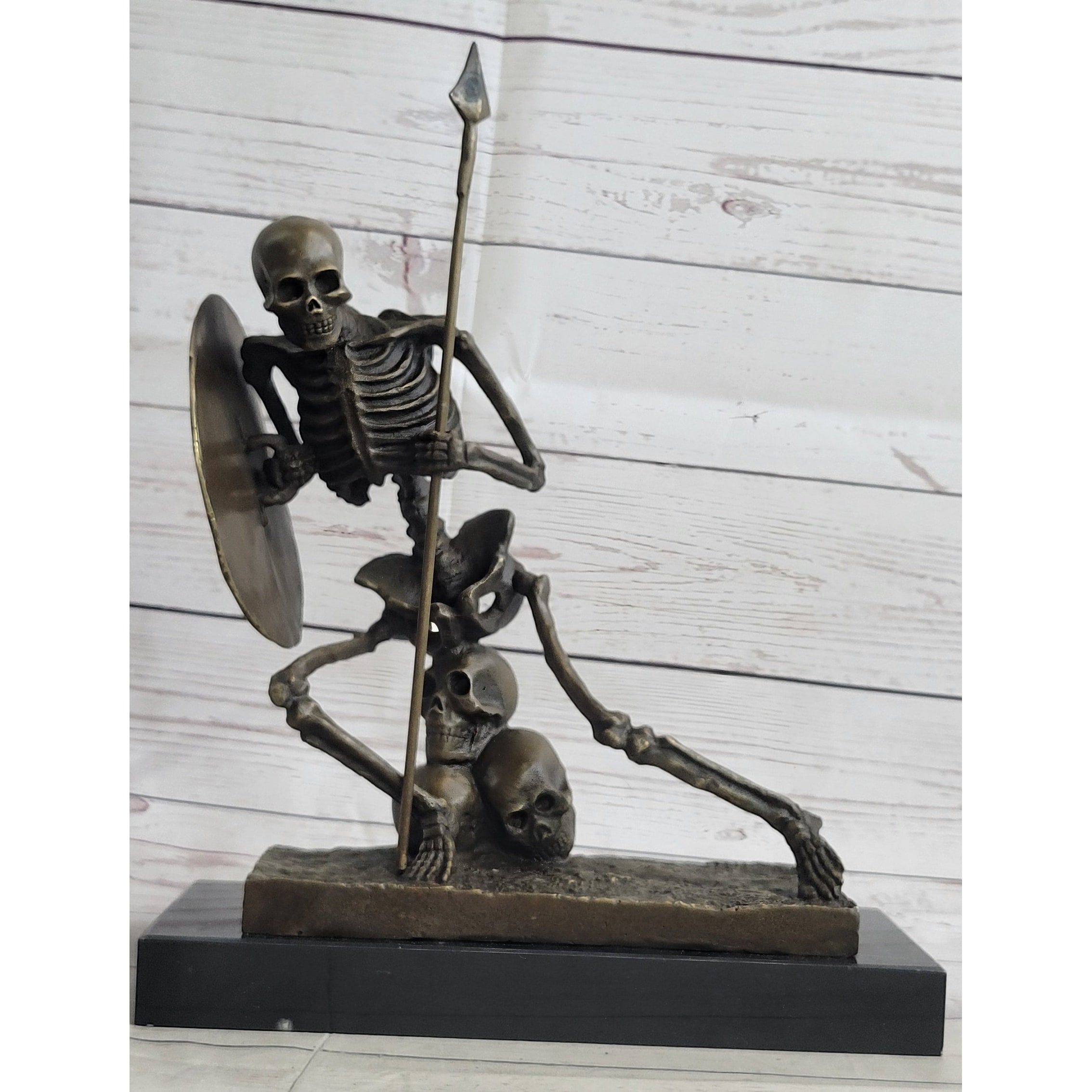 Skeleton Warrior W/ Shield And Spear Bronze Statue Sculpture Marble Base 12 Inches X 10 Inches