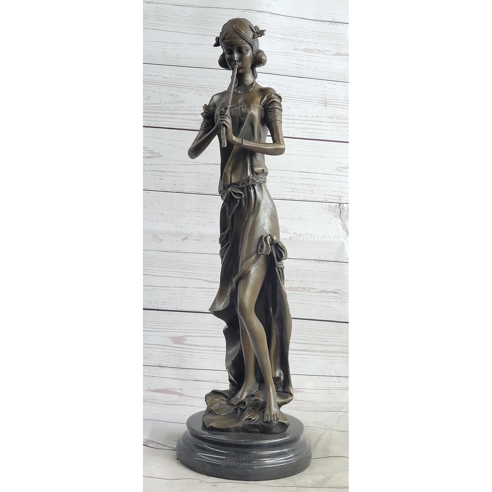 Girl Playing The Flute Female Musician Bronze Sculpture Statue Figure On Marble Base
