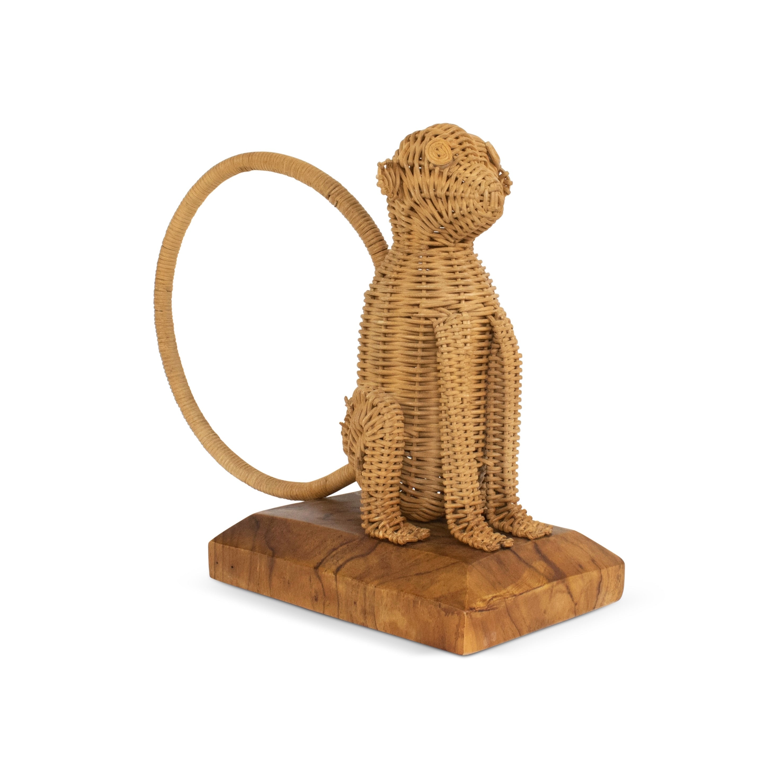 Rattan Monkey Sculpture - Hand Woven Animal Figurine on Wood Stand, Tropical Boho Decor - 10.5" wide x 10" tall x 5" deep