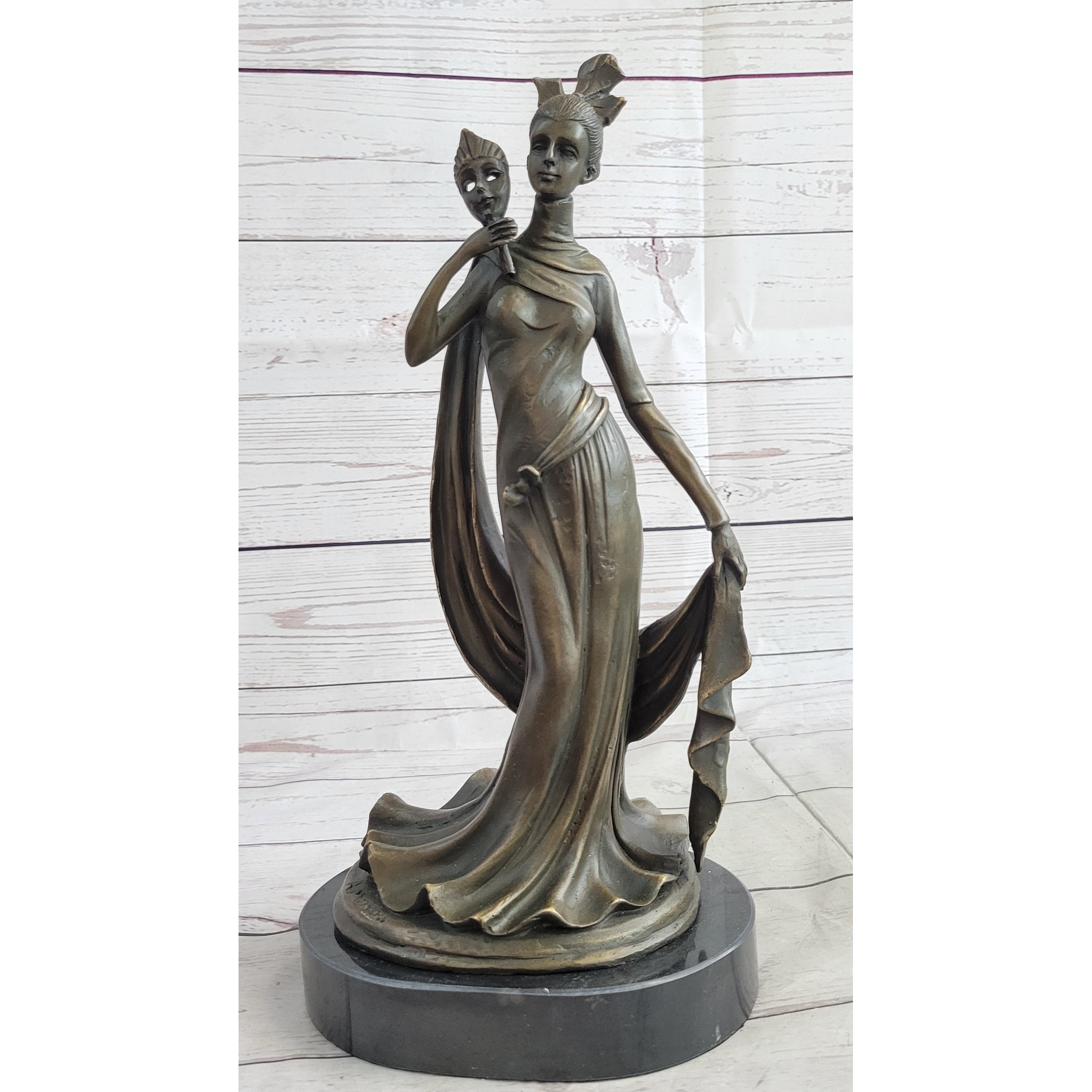 Masquerade Ball Art Deco Bronze Statue Sculpture Figure Holding Mask 14 Inches X 7 Inches