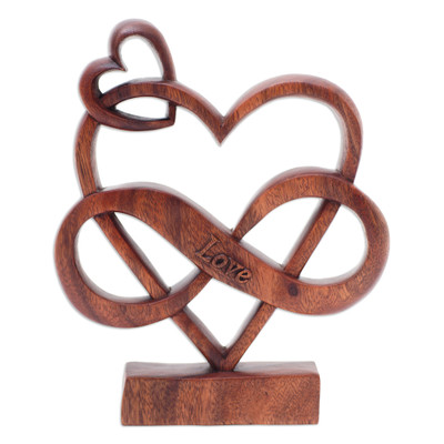 The Last Love,'Hand-Carved Heart-Themed Suar Wood Sculpture in Brown'