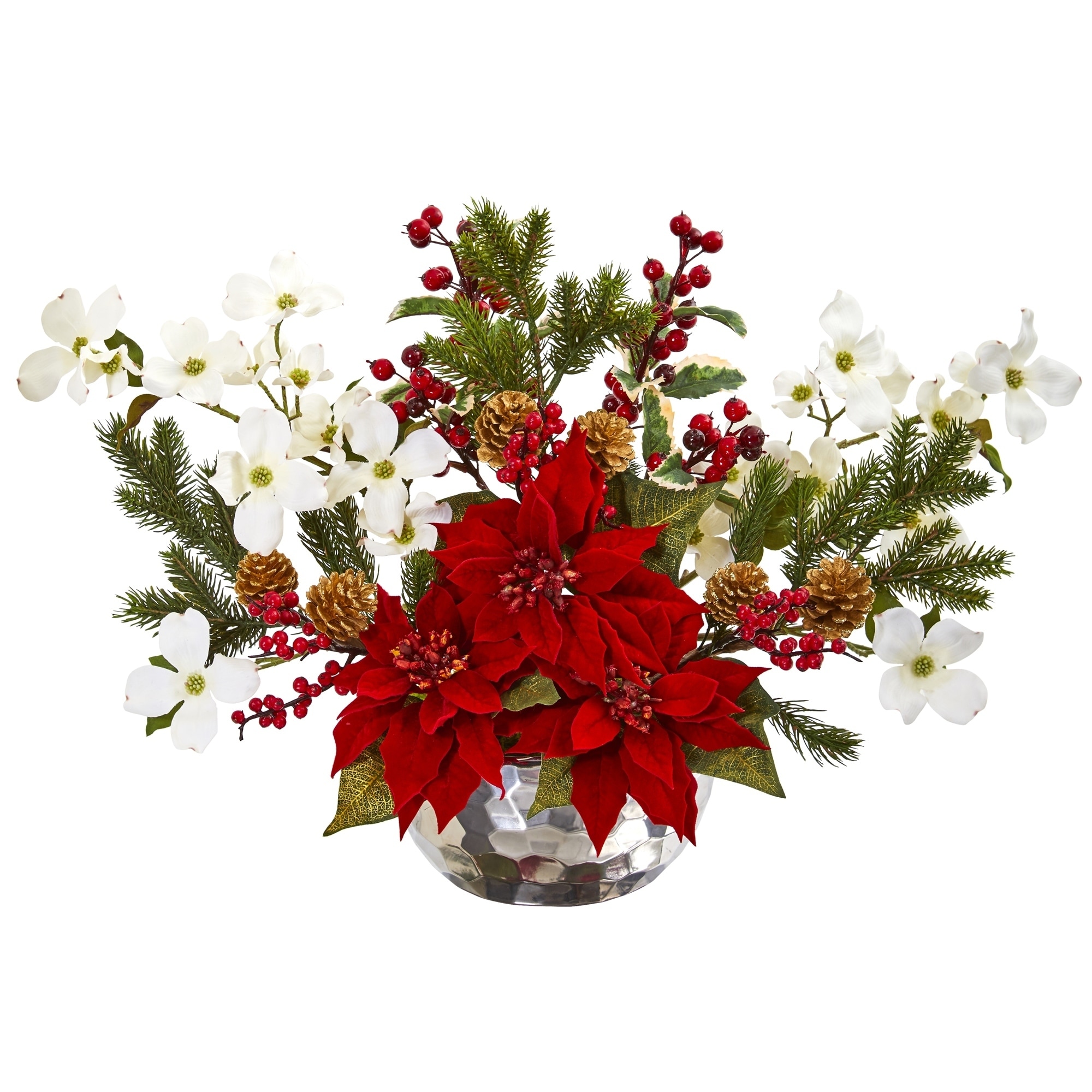 Poinsettia, Dogwood, Berry and Pine Artificial Arrangement in Silver Vase